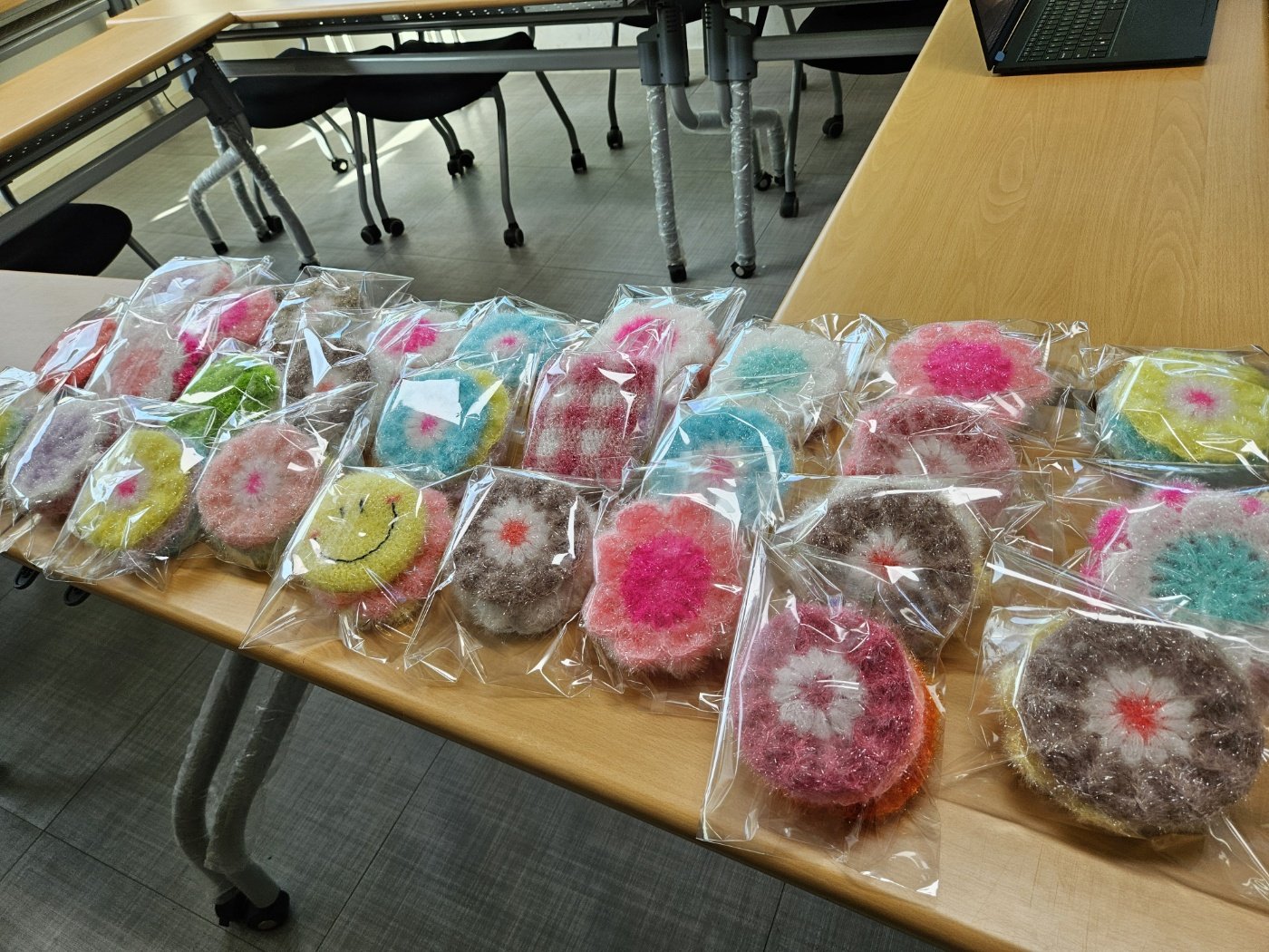 천마중학교의 [오정은 학부모님]께서 직접 예쁘게 뜨신 수세미를 후원해주셨는데요.