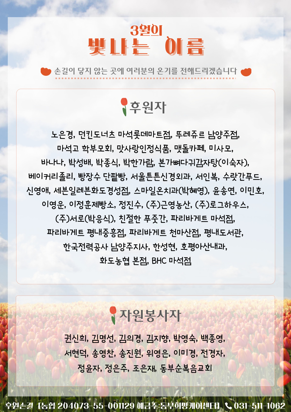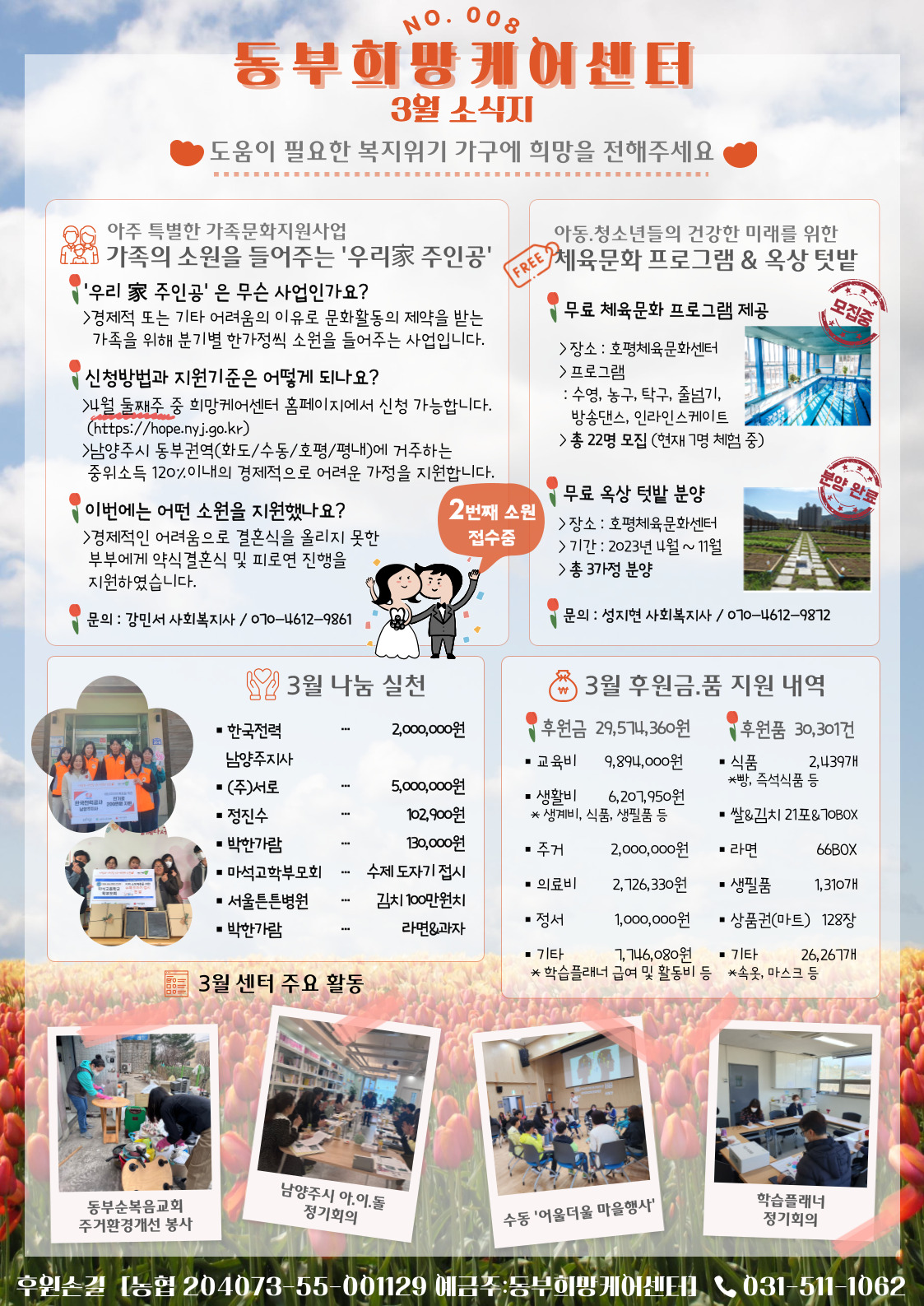 동부희망케어센터 동부희망케어센터 / 2023년 3월 센터 소식지 등록일자 2023-04-10 조회 215 내용 안녕하세요. 동부희망케어센터입니다. 오늘은 3월 한 달 동안 동부희망케어센터가 어떤 시간을 보냈는지와 함께 어둠을 밝혀준 빛나는 이름들을 소개합니다. 감사합니다. 첨부파일 1 소식지.jpg [ Size : 618.19KB, Down : 65 ] 미리보기 다운로드 2 후원자 및 자원봉사자(웹용).jpg [ Size : 449.88KB, Down : 59 ] 미리보기 다운로드 목록보기