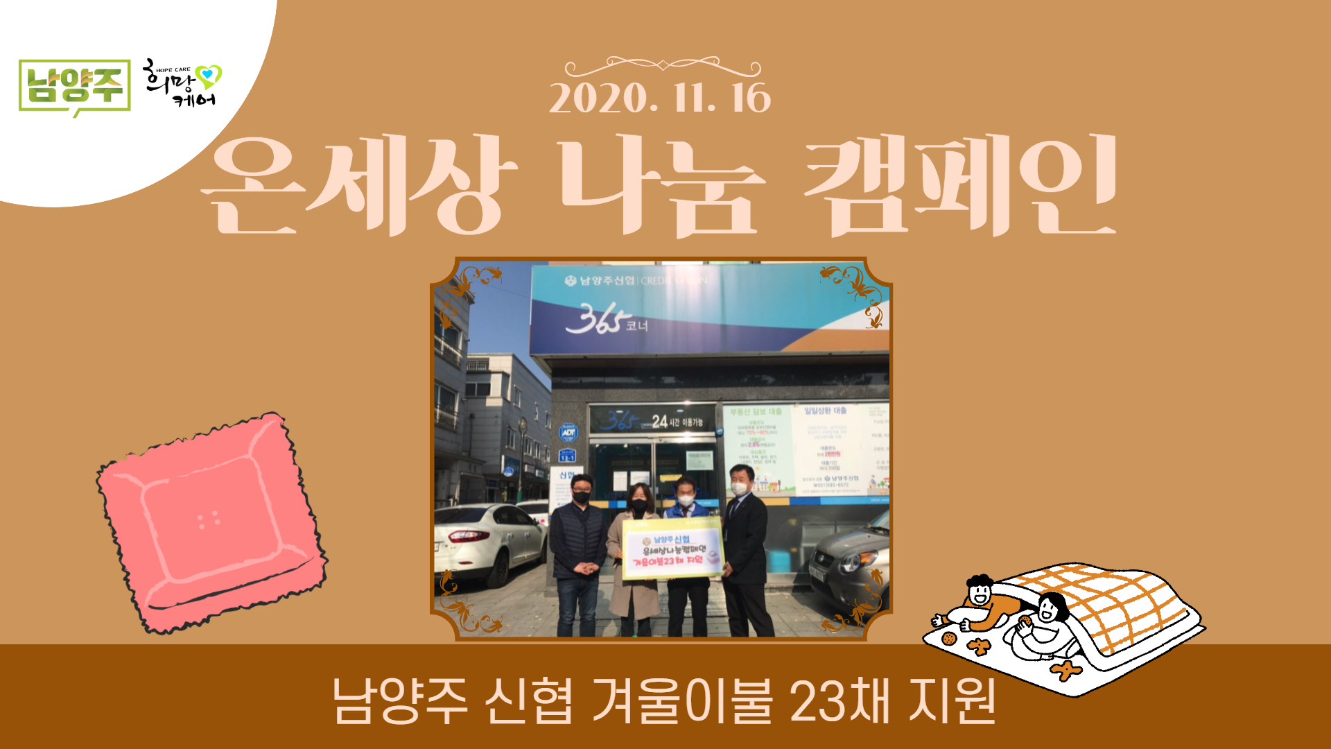 동부희망케어센터 동부희망케어센터, 남양주 신협 겨울이불 23채 후원 등록일자 2020-11-17 조회 209 내용 11월 16일 남양주 신협에서 겨울이불 23채를 후원해주셨습니다. 호평동에 위치한 신협 직원 분들께서 마을을 모아 어려운 이웃들에게 전달하기 위한 나눔을 해주셨습니다. 항상 잊지 않고 후원해주셔서 감사드립니다. 첨부파일 신협 후원품 전달.jpg [ Size : 731.63KB, Down : 66 ] 미리보기 다운로드 목록보기