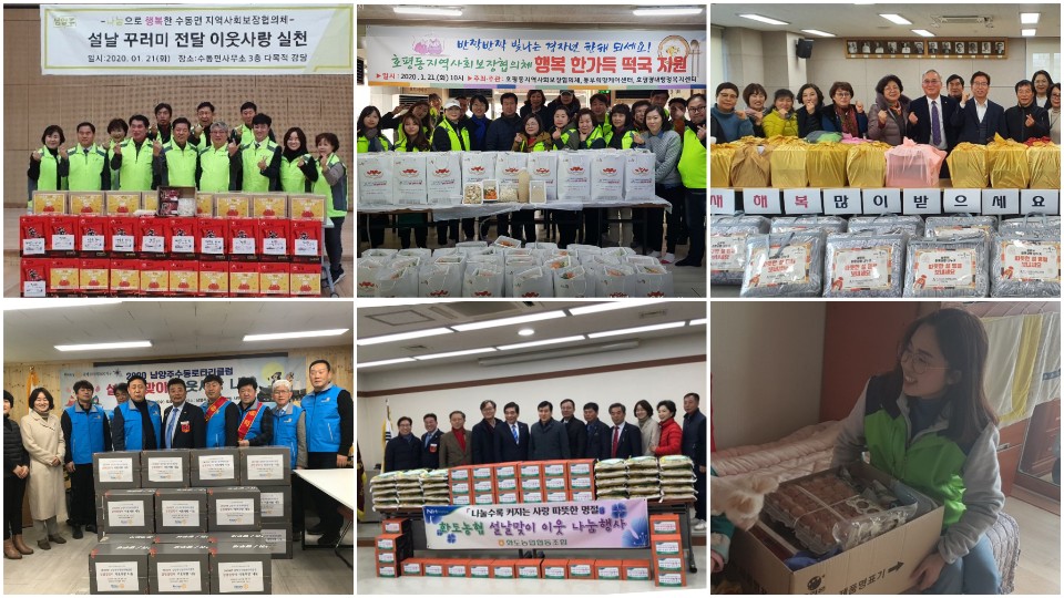 2020년 1월 동부희망케어센터는 명절을 맞이하여 많은 나눔활동이 있었다. 맷돌36 숯불갈비의 식용유(set), 경기철물점의 사랑의 라면(70ox), 화도사랑, 수동로타리클럽, 한국전력남양주지사, 남양주도시고속도로의 선물꾸럼이, 화도농협의 이웃사랑 떡국떡, 김삿갓 밥집의 식용유(set) 등 지역사회의 다양한 후원과 지역사회보장협의체를 통한 나눔 활동이 있었다. 전달받은 후원물품은 지역 내 독거 어르신 및 취약계층에게 전달되었다.