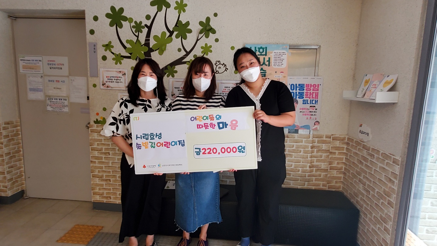 어린이들의 "따뜻한 마음" 코로나로 어렵고 힘든 우리의 현재도 감당하기 어렵지만, 여전히 우리의 주변에는 관심이 필요한 분들이 계십니다. 이런 우리 이웃들을 위해 이번에는 시립효성솔빛길 어린이집(원장 유귀순) 원아들과 학부모님들께서 함께 해주셨습니다. 금일(8월 19일) 전달식이 진행되었으며, 이번 후원금은 시립효성솔빛길어린이집에서 아나바다 행사를 통해 함께 마련한 수익금이라 더욱 의미가 깊었습니다. 전달식에 참석한 시립효성솔빛길어린이집 유귀순원장은 “주변 이웃들과 함께 나누고 베풀 수 있는 다양한 교육과정 중의 일환으로 금액이 크진 않지만 취지에 맞게 전달된 수익금이 주변의 어려운 이웃에게 많은 도움이 되길 바란다.”고 말씀해 주셨습니다. 오늘의 경험이 사랑을 나눌 줄 아는 멋진 어른으로 자라는 밑거름이 되었기를 바랍니다. 고사리손으로 이웃들을 위해 마음을 모아준 어린이들과 학부모님들, 선생님들께 다시 한번 진심으로 감사드립니다.