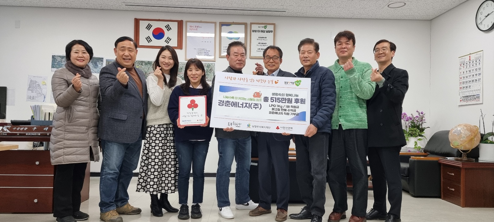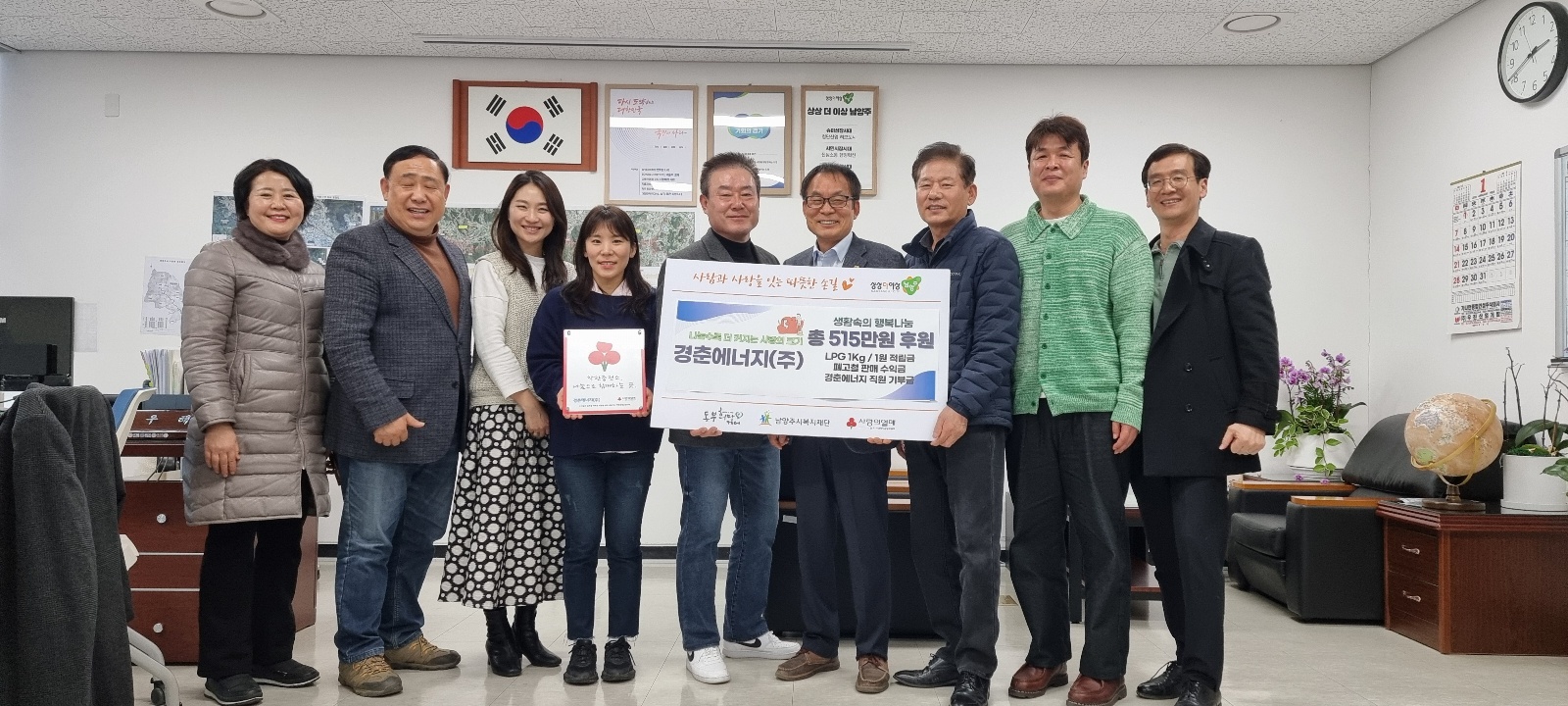 안녕하세요 동부희망케어센터입니다. 지난 26일 경춘에너지(주)에서 후원금 515만원을 전달해주셨습니다. 경춘에너지(주)는 2009년부터 동부희망케어센터에 꾸준히 후원을 해주고 계시는데요, 이번 후원금은 LPG판매수익 285만원, 폐고철판매수익 120만원을 해주셨고, 직원 기부금 110만원까지 모아 후원의 뜻을 함께 해주셨습니다. 항상 지역 주민을 위해 후원해주시는 경춘에너지(주)에 감사의 말씀 전해드립니다. 쌀쌀한 날씨가 이어지고 있는데요, 건강 유의하시고 오늘도 행복한 하루 되세요 :)