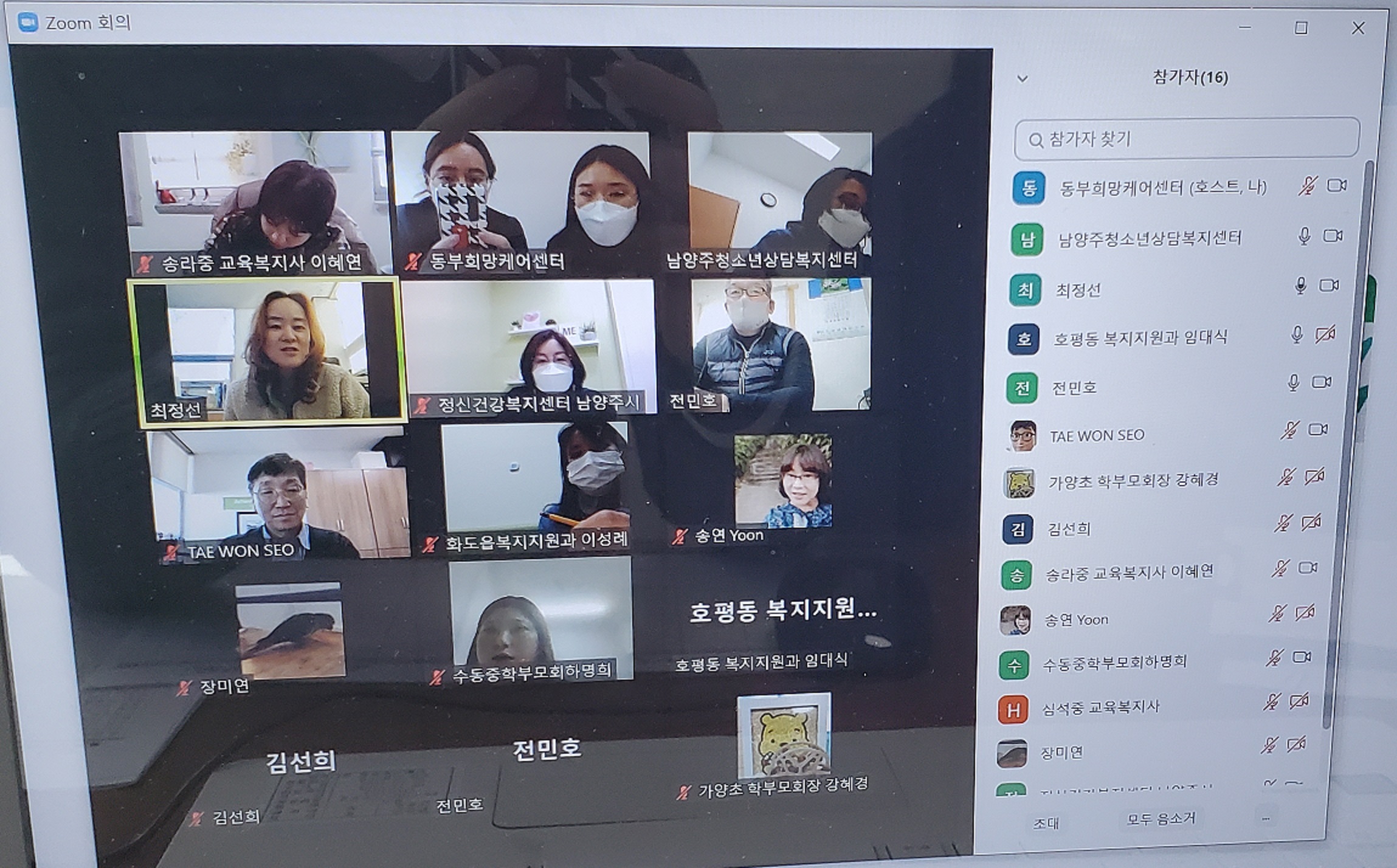 12월 13일 저희 『남양주 아이돌』에서는 2021년 한해 마무리와 함께 새롭게 시작될 2022년 한 해를 위해 6차 정기간담회를 진행하였습니다. 코로나19 재확산으로인해 16개 기관 19명의 네트워크 위원이 비대면 회의로 만나 새롭게 남양주 아이돌과 함께 해 주실 KACE남양주의 소개와 2021년 『남양주 아이돌』 활동과 사업현황 공유, 참여 기관에 대한 감사한 마음을 전달하는 시간을 가졌습니다. 올해 마지막 간담회인 만큼 함께 모여 2022년 계획에 대해 논의하고 진행하고 싶었으나 안전하고 건강히 만날 다음 회의를 기약하며 마무리 되었습니다. 아동청소년 위기 돌봄 네트워크 『남양주 아이돌』과 함께 고민하고 노력해주셔서 감사합니다. 2022년에도 남양주시 아동/청소년의 건강한 성장을 위해 노력하겠습니다.