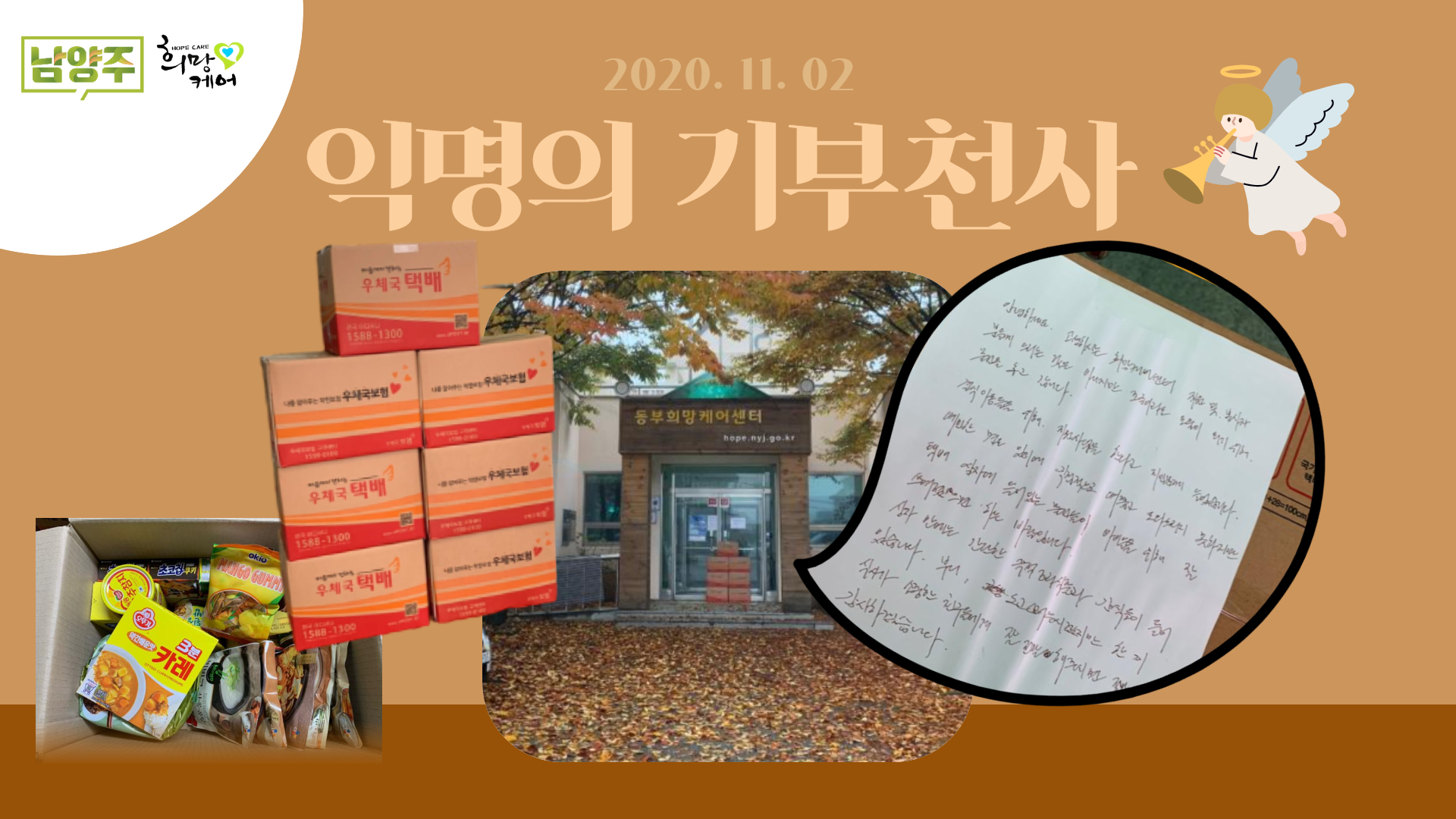 동부희망케어센터 동부희망케어센터, 익명의 천사가 나타나다. 등록일자 2020-11-11 조회 203 내용 2020년 11월 2일 출입문에 익명의 기부자가 방문하였습니다. 코로나19로 인한 결식우려아동에 대한 소식을 들으셨다며 아이들이 좋아할 만한 간식과 간단한 식사들을 준비했으니 소중한 친구들에게 잘 전달을 부탁한다는 내용의 편지와 함께 상자를 전달해주셨습니다. 주말에 다녀간 익명의 기부자님께 감사드립니다. 첨부파일 1102 익명기부.jpg [ Size : 1008.98KB, Down : 66 ] 미리보기 다운로드 목록보기