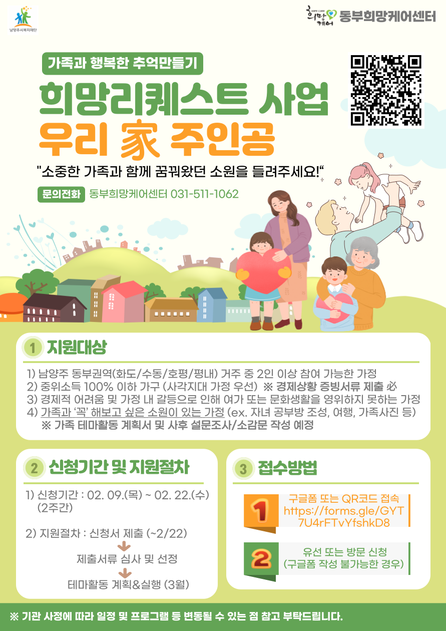 1. 지원대상 : 남양주 동부권역(화도/수동/호평/평내) 거주 중 하기 1), 2) 에 해당되며 2인 이상 참여 가능한 가정