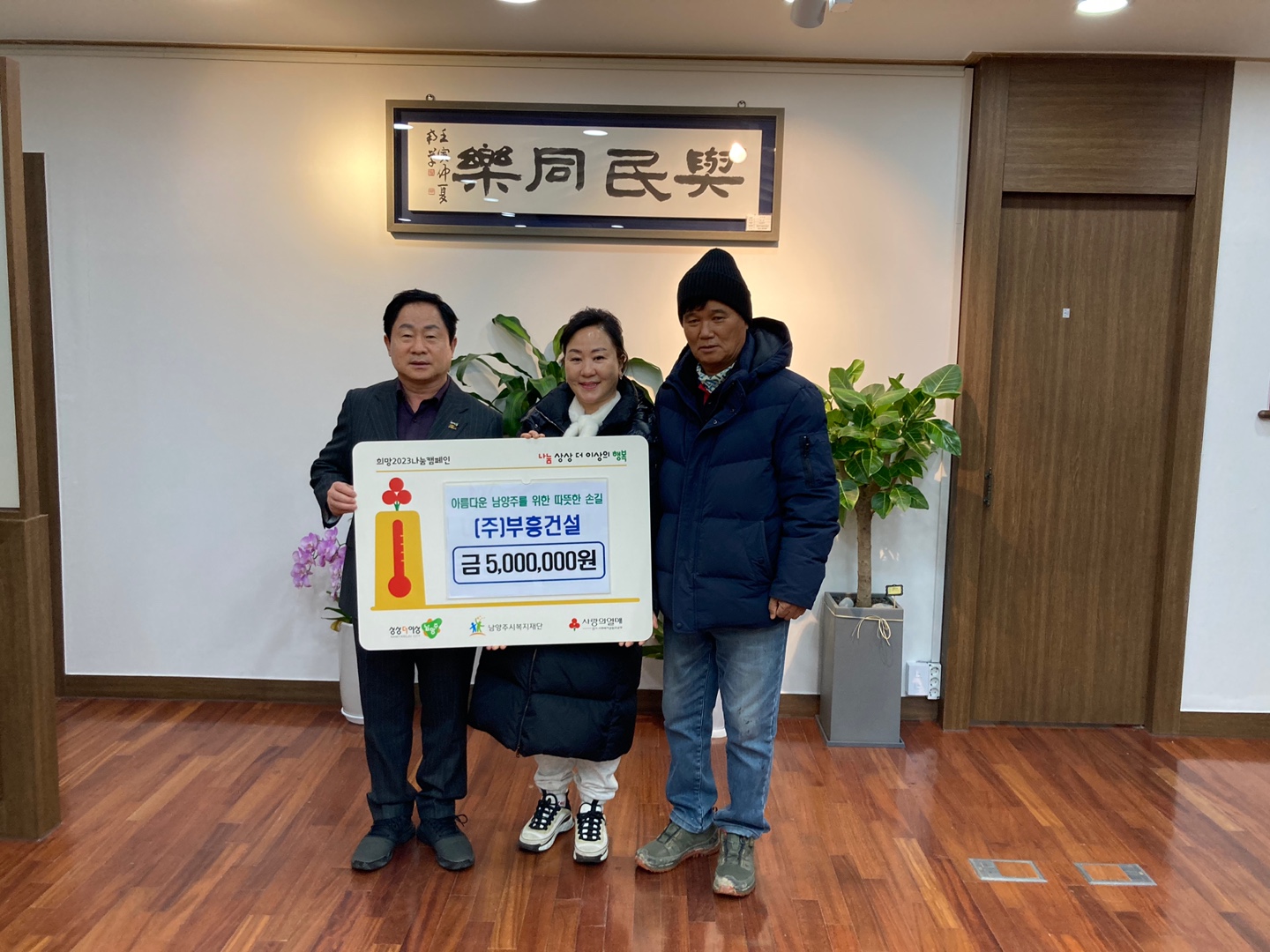 안녕하세요. 동부희망케어센터 입니다. 오늘 9일 수동면에 위치한 ‘㈜부흥건설(우현아 대표)’에서 우리 주변의 어려운 이웃들을 위해 500만원을 후원해주셨습니다. 후원금은 남양주시복지재단에서 진행하고 있는 ”희망 2023 나눔 캠페인 사랑의 온도탑“에 모금하였으며, 모인 후원금은 도움이 필요한 남양주 시민을 위해 사용될 예정이라고 합니다. ‘㈜부흥건설’의 우현아 대표님은 지난 2018년부터 지역 복지발전을 위해 명절마다 식료품을 후원하고 코로나로 인한 경기 불황에는 3,000만원을 후원하는 등 지역 내 소외계층을 위한 후원을 꾸준히 실천하고 계시는데요, 누구보다 힘들 때도 이웃을 먼저 생각하고 나눠주신 우현아 대표님께 건강과 행복이 함께하길 바랍니다.