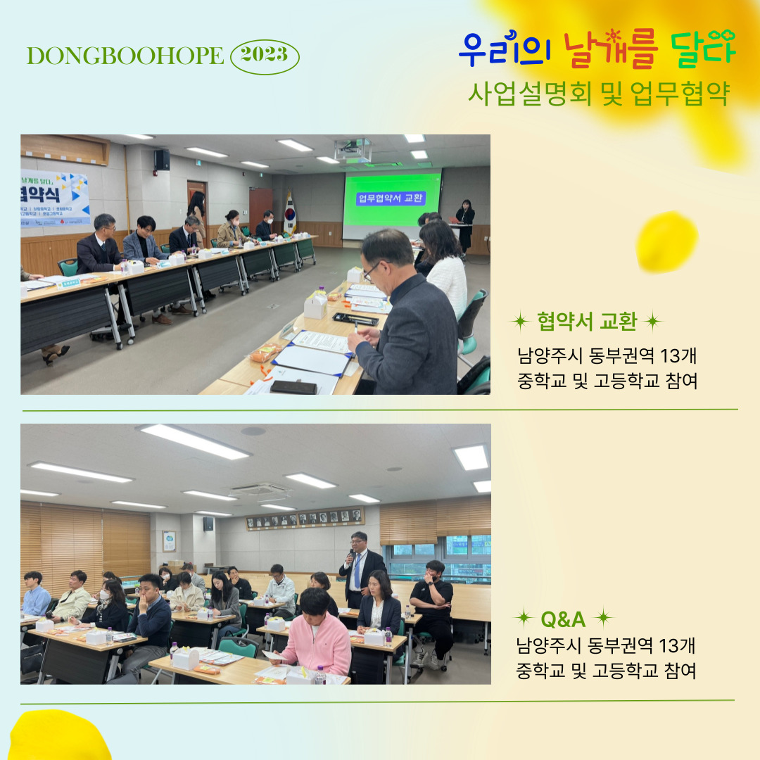 안녕하세요. 동부희망케어센터 입니다. 나무를 심는 식목일인 4월5일에 저희 동부희망케어센터도 한 그루의 희망을 심었습니다. 바로 우리 미래의 희망이 되어줄 청소년들이 지역 내에서 안전하고 건강하게 성장할 수 있는 밑거름을 만들기 위해 지역의 16개 중.고등학교의 학교장, 선생님들이 함께 모여 업무협약을 체결하였습니다. 관련 사업인 「우리의 날개를 달다」 프로그램은 동부권역 내 중.고등학교에서 사회봉사명령 조치를 받은 청소년들에게 체계화된 프로그램을 제공하여 봉사 활동을 수행하고 자신의 삶의 밸런스를 찾는 기회를 경험하게 하고자 계획되었으며 총 3일간의 프로그램으로 진행될 예정입니다. 그동안 동부권역 내에는 사회봉사명령을 수행할 기관이 없어 많은 학교와 학생들의 고충이 있었기에 저희 동부희망케어센터가 지역을 위해 프로그램을 만들게 되었습니다. 많은 관심 부탁드립니다. 감사합니다.