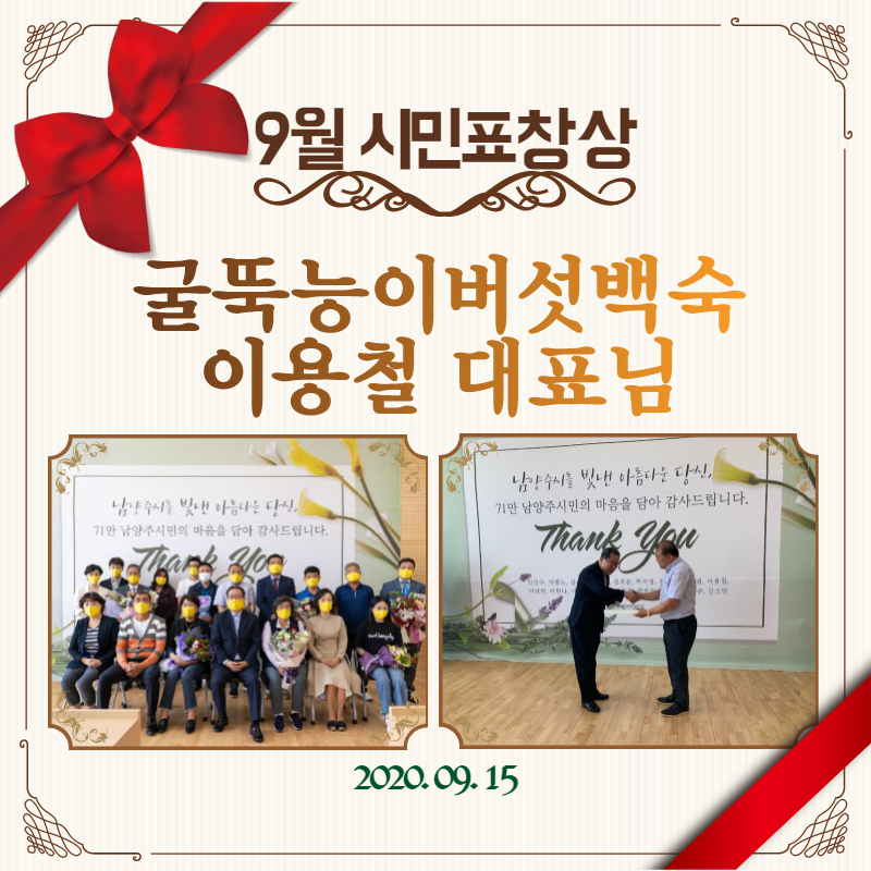 9월 15일 남양주시장상은 굴뚝능이버섯백숙 이용철 대표님께서 수상하였습니다. 굴뚝능이버섯백숙 이용철 대표님께서는 남양주시에 사업장을 운영하시면서 독거노인에게 외식지원 서비스를 지원하고, 지역 내 장애인생활시설에 물품을 후원하며 봉사활동 실천하였습니다. 그외에도 다양한 도움으로 남양주시에 나눔을 전파하고 계십니다. 수상을 진심으로 축하드립니다.