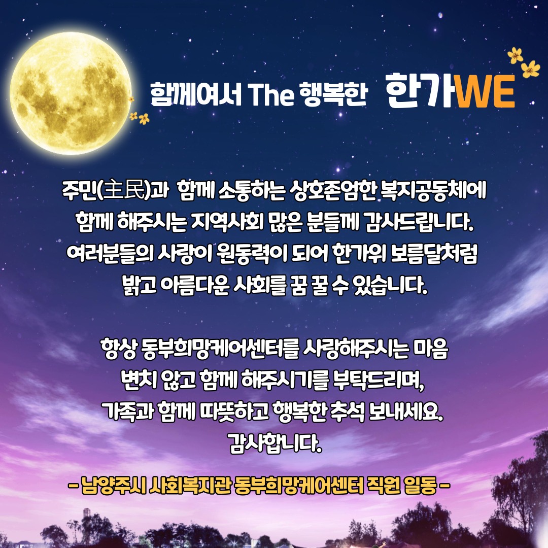 동부희망케어센터 함께여서 The 행복한 한가WE 등록일자 2024-09-13 조회 158 내용 안녕하세요, 동부희망케어센터 입니다 :)함께여서 The 행복한 한가WE 입니다 ~ 늘 저희와 함께 해주시고 웅원해주시는 모든분들께 진심으로 감사드립니다.앞으로도 지금처럼 동부희망케어센터를 아껴주시고 함께 해 주실거죠?보름달처럼 밝고, 행복함이 가득 채워지는 추석 보내세요, 감사합니다 ♡ 첨부파일 222.jpg [ Size : 288.02KB, Down : 85 ] 미리보기 다운로드 목록보기
