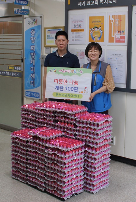 남양주시청에서 장애인행정도우미로 근로하는 고근형씨는 지난 5일, 여름철 취약 계층들의 영양보충을 위해 계란 100판(50만원 상당)을 남양주시 화도읍에 위치한 사회복지기관 동부희망케어센터(센터장 최정선)에 전달하였다.