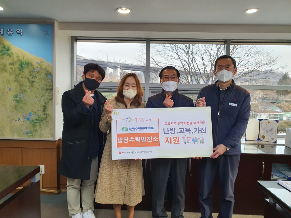지난 12월 10일 팔당수력발전소에서는 남양주시사회복지관 동부희망케어센터와 소외계층 지원을 위한 후원 협약식이 진행되었습니다. 이번 협약은 화도지역에 거주하고 있는 난방 취약가구와 코로나로 힘든 시기를 보내고 있는 소외계층을 돕기 위해 팔당수력발전소의 지원으로 이루어졌으며, 협약을 통해 전달된 팔당수력발전소의 소중한 후원금은 난방취약가구의 난방비와 아동?청소년의 교육비, 그리고 그 외 일상생활에 어려움이 있는 이웃들에게 전달될 예정입니다. 2015년부터, 우리 화도지역의 어려운 이웃을 위해 경제, 식생활, 교육, 심리?정서지원을 위해 다양한 영영에서 나눔을 실천해오고 계신 팔당수력발전소 여러분들께게 감사의 마음을 전하며 그 소중한 마음이 잘 전달될 수 있도록 도움이 필요한 우리 이웃분들에게 잘 전달하겠습니다.