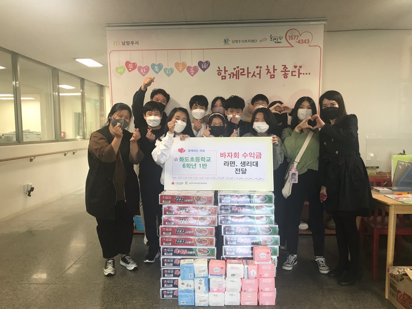 지난 10월 29일, 화도읍 소재 화도초등학교 6학년 1반 학생들은 반에서 진행된 바자회(10월 14일) 수익의 50%와 담임교사의 기부금을 포함해 관내 어려운 또래 친구들에게 도움을 줄 것을 요청하며 필요한 물품(생리대, 라면)을 준비해 센터를 방문해 주었습니다. 이번 바자회는 아이들의 인성교육 강화의 일환으로 더불어 함께 살아가는 나눔과 배려의 정신을 함양하고자 이루어 졌으며, 반 자치회에서 아이들 스스로 바자회 진행 및 나눔에 대한 논의를 통해 자발적인 기부 활동을 경험할 수 있는 좋은 기회가 마련되었다고 합니다. 화도초등학교 6학년 1반 아이들의 밝은 미소만큼이나 따뜻한 기부물품은 소중하게 각 가정에 전달하도록 하겠습니다.