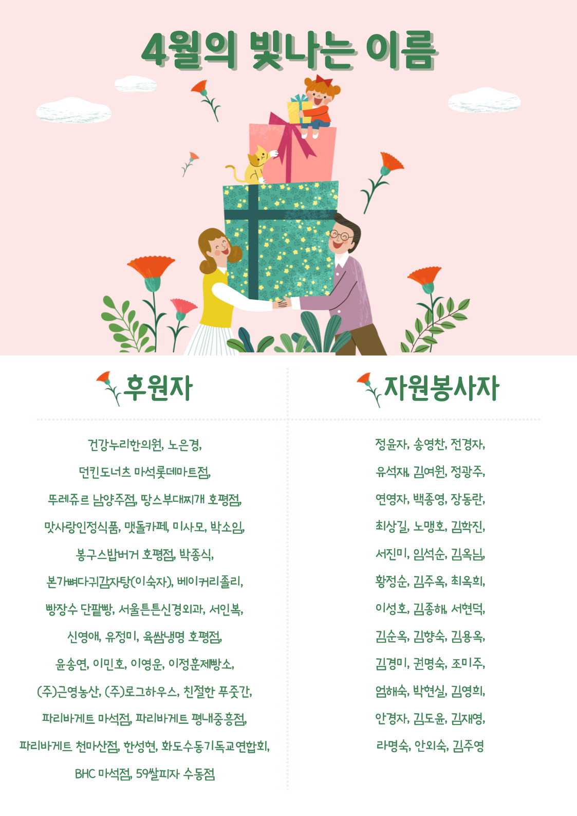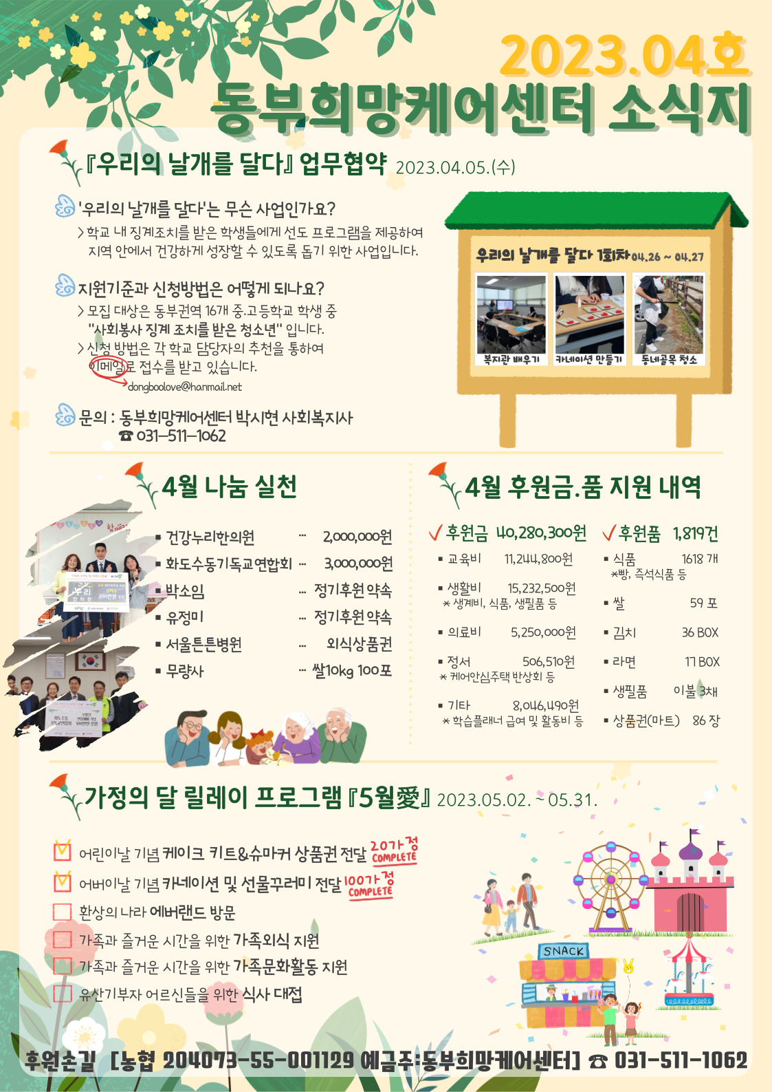 동부희망케어센터 동부희망케어센터 / 2023년 4월 센터 소식지 등록일자 2023-05-11 조회 245 내용 안녕하세요. 동부희망케어센터입니다. 오늘은 4월 한 달 동안 동부희망케어센터가 어떤 시간을 보냈는지와 함께 어둠을 밝혀준 빛나는 이름들을 소개합니다. 감사합니다. 첨부파일 소식지(웹용).jpg [ Size : 526.16KB, Down : 74 ] 미리보기 다운로드 후원자 및 자원봉사자 명단(웹용).jpg [ Size : 313.57KB, Down : 90 ] 미리보기 다운로드 목록보기