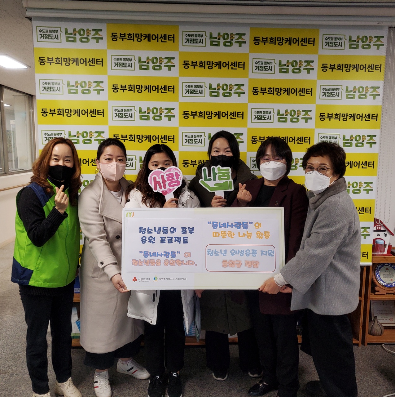 12월 22일 동부희망케어센터에서는 행복한 선물을 가지고온 분들이 계십니다. 같은 마음으로 결성된 ‘동네사람들’ “도움을 준다면 가까이 우리 지역 청소년들에게서부터 시작하자.” 남양주시 지역주민들의 자발적인 참여로 이루어진 “동네사람들”은 청소년들이 꿈과 희망을 가지고 높이 도약하기를 바라는 마음에서 시작되어, 그 첫 번째 활동으로 청소년들의 위생용품 지원을 위해 남양주시사회복지관 동부희망케어센터에 후원금을 지정 기탁해주셨습니다. 이날 진행된 전달식은 청소년들의 위생용품 지원을 위한 후원금 기부로 청소년들의 도약을 응원하는 마음으로 모아졌으며, 청소년들의 위생용품 지원을 위한 정기 기부도 약속해 주었습니다. 전달식에 함께 참석한 청소년 자녀 역시 정기기부에 동참 의사를 밝혀 더욱 의미가 깊은 전달식이 되었습니다. 지역사회 통합돌봄을 실천하고 계신 “동네사람들”의 마음에 감사 인사를 전하며 앞으로도 회원분들의 선한 영향력이 지역사회로 확산되길 기대합니다.
