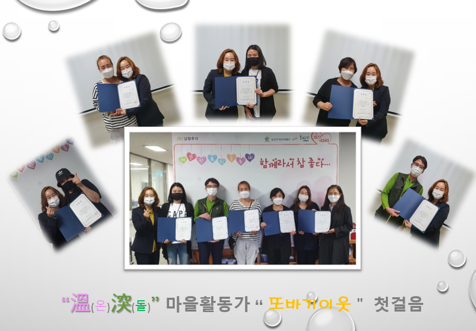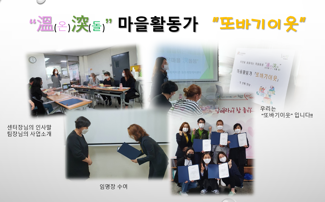 동부희망케어센터는 희망을 물들이는 마을돌봄 “溫(온)?(돌)” 사업 진행을 위한 마을활동가 “또바기이웃”이 모집이 되었습니다. 6월부터 활동을 시작할 또바기이웃은 앞으로 남양주시 지역안에서 병원, 요양시설에서 퇴소하신 지역복귀희망자(노인, 장애인, 정신질환)가 지역사회 내에 안정적 자립을 할 수 있도록 세세하게 이웃을 돌볼 예정입니다. 앞으로도 또바기이웃의 활동에 관심 가져 주시고 주민이 주민을 돕는 선순환 복지구현에 함께 동참해 주시면 감사하겠습니다!!