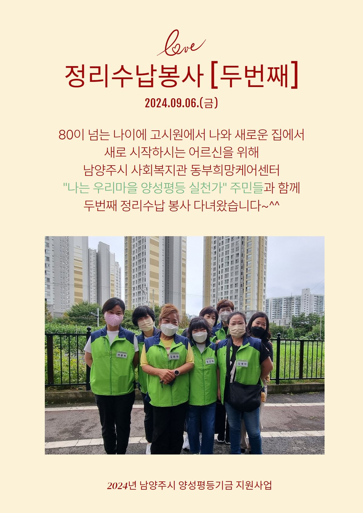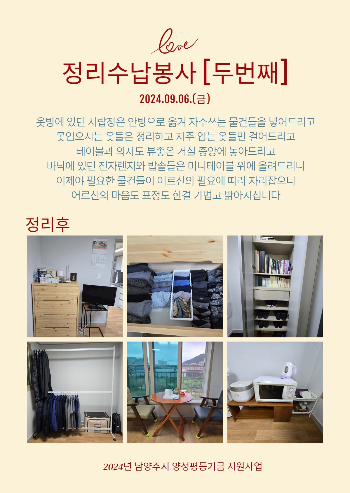 남양주시 사회복지관 동부희망케어센터에서는 "나는 우리마을 양성평등실천가" 주민교육을 통해 정리수납정리 기술을 습득하였었는데요.