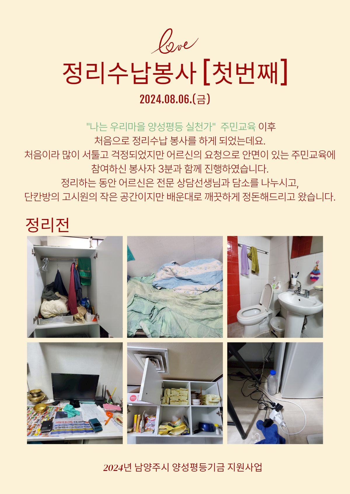 그중 한가지 방법으로, 우리 마을에 1인 남성가구에 방문하여 두번의 정리수납봉사활동도 진행했는데요.