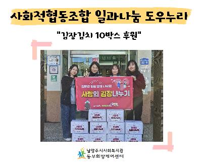 게시판 검색 구분 : 구분 전체보기 전체 동부희망케어센터 서부희망케어센터 남부희망케어센터 북부희망케어센터 검색 영역 : 전체 검색제목내용검색어 : 검색하기 남부희망케어센터 [남양주시사회복지관 남부희망케어센터]2026년 동계방학 사회복지현장실습생 모집 안내 <<남양주시사회복지관 남부희망케어센터 2026년 동계방학 사회복지현장실습생 모집 안내>> 1. 실습 기간 및 분야 가. 실습기간 : 2026년 1월 5일(월) ~ 2026년 1월 30일(금) / 20일 / 160시간 나. 실습시간 : 주중(월~금), 09:00~18:00(일 8시간) 다. 실습분야 : 사회복지관 3대 기능사업에 대한 이해 / 프로포절 / 각종 사회복지 행정업무 / 홍보 등 2. 신청 방법 및 모집 절차 가. 모집기간 : 2025년 11월 17일(월) ~ 11월 28일(금) 18:00 나. 모집인원 : 3명 예정 다. 신청자격 : 1) 4년제 대학교 사회복지학과(및 관련학과) 3학년 이상 재학생 2) 전문대학교 사회... 2025-11-13 남부희망케어센터 [남부희망케어센터] 2025년 47호 복지관 소식지가 발간되었습니다! 안녕하세요!남양주시 사회복지관 남부희망케어센터입니다.높고 푸른 하늘, 선선한 바람이 함께하는 가을입니다.지난 여름 동안 남부희망케어센터와 함께한 따뜻한 순간들을 담은2025년 제47호 뉴스레터가 발간되었습니다.7월부터 9월까지 지역주민, 봉사자, 후원자 여러분과 함께한나눔과 성장, 감동의 이야기들을 만나보실 수 있습니다.많은 관심과 응원 부탁드립니다. :) 2025-10-22 북부희망케어센터 2025년 남양주시사회복지 북부희망케어센터 홍보영상!! 안녕하세요 여러분, 따끈따끈한 소식 전해드립니다! : >지난 상반기 촬영했던 홍보영상이 드디어 나왔습니다~!남양주시복지재단 대표 이사님의 인사말, 직원들의 인재상 소개, 사례관리 대상자의 일상 모습 등을 담은 홍보영상은 북부희망케어센터 유튜브에서 확인할 수 있으니 많은 관심과 사랑부탁드립니다.북부희망케어센터 유튜브 영상 보러가기!https://youtu.be/ZGXi-Lf-YJs?si=5GVQcxvEGoorYoh- 2025-07-07 동부희망케어센터 남양주시 사회복지관 동부희망케어센터 [이용자 고충처리 접수 안내] 안녕하세요, 남양주시 사회복지관 동부희망케어센터 [고충처리위원회]입니다. 우리 복지관에서는 복지관을 이용하시는 중 발생하는 이용자분들의 다양한 불편사항들을 청취하고 보다 신속하게 해결하고자 고충처리 위원회를 운영하고 있으며 이용자분들의 작은 소리에도 귀 기울이고 불편사항 해결에 최선을 다하겠습니다. ■ 진행절차 상담신청 ⇨ 접수 ⇨ 회의(고충처리위원회) ⇨ 조치 ⇨ 결과통보 고충 내용은 고충처리위원회 외 열람이 제한되며 신청자가 공개를 원하지 않을 경우 진행 과정은 모두 비공개로 처리됩니다. 그 외에는 접수, 조치사항, 조치결과를 7일 이내에 신청자에게 개별 연락하고 홈페이지에도 게시합니다. ■ 참여방법 1. 이용자 고충처리함(소리함) 가. 위치 : 복지관 1층 ... 2025-06-26 동부희망케어센터 2024년 ESG 복지경영 2024년 남양주시 사회복지관 동부희망케어센터는 ESG 복지경영을 실천합니다. 2024-06-25 남부희망케어센터 남부희망케어센터 시설 대관 안내 *대 상 : 지역주민 누구나*대관시간 : 평일 10:00~17:00 (주말 및 공휴일은 휴관)*대관공간 : 주민소통공간 '덕담' 및 사례회의실*대관범위 : 지역주민 간의 주민모임 및 동아리 진행 또는 센터와 추진하는 사업과 관련 (단, 정치성 및 종교행사, 영리행위 등의 목적의 경우 대관이 불가합니다.)*이용안내 : 유선문의(031-593-9023~4) ※ 활동 내용 및 기관 일정에 따라 대관이 불가할 수 있습니다. <주민소통공간 덕담> 사진 입니다. 2024-05-30 동부희망케어센터 [이마트 남양주점] 김치 후원 전달식 안녕하세요, 동부희망케어센터입니다 ❤작년에 이어 올해도 (주)이마트 남양주점에서 포기김치 171박스를 후원해주셨습니다!매년 겨울철이면 저희 센터를 잊지 않고 챙겨주시는 이마트 남양주점 덕분에, 지역 가정들이 따뜻한 겨울을 보내고 있습니다.이마트 김치는 1인 가정에서도 부담 없이 즐길 수 있는 양으로, 각 가정에서 너무 좋아하시고 만족도가 높답니다.이마트 남양주점은 포기김치뿐만 아니라 매월 생필품과 다양한 물품도 후원해주셔서, 긴급한 상황이나 일상에 지원이 필요한 가정에 큰 힘이 되고 있습니다.지역을 위해 꾸준히 나눔을 실천해주시는 이마트 남양주점에 진심으로 감사드립니다 ♡☞이마트 남양주점: 경기 남양주시 늘을2로 27 E-MART 2025-11-20 서부희망케어센터 [사업] ‘뚜벅뚜벅 일상생활도전기!’ 최종 평가회 소식 ‘뚜벅뚜벅 일상생활도전기!’ 최종 평가회 소식발달장애 청소년들의 일상 자립을 응원하는 특별한 여정,서부희망케어센터가 진행한 『뚜벅뚜벅 일상생활도전기!』가지난 11월 18일,그 성과를 나누는 평가회로 마무리되었습니다.지난 8개월 간 티머니복지재단의 지원으로 진행된 이번 프로그램은우리 친구들이 세상 밖으로 한 걸음 더 나아가는 소중한 시간이었는데요!이번 프로그램은 총 9회기에 걸쳐- 대중교통·공공시설 이용- 금전관리 연습- 사회적 의사소통 훈련 등발달장애 청소년들이 실제 생활에 꼭 필요한 자립 기술을단계별로 배우는 시간으로 구성됐어요.특히 학교