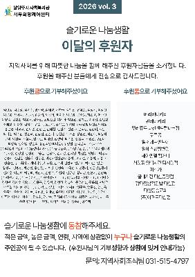 게시판 검색 구분 : 구분 전체보기 전체 동부희망케어센터 서부희망케어센터 남부희망케어센터 북부희망케어센터 검색 영역 : 전체 검색제목내용검색어 : 검색하기 남부희망케어센터 [남부희망케어센터] 2026년 4월 Vol.19 우리동네 주요 복지소식 「마음이음」 이 발간되었습니다! [남부희망케어센터] 2026년 4월 Vol.19 우리동네 주요 복지소식 「마음이음」 이 발간되었습니다! 2026년 1분기 남양주시 우리동네 주요 복지소식지「마음이음」 이 발간되었습니다. 이번 소식지에는▲ 남양주시복지재단 및 권역별 희망케어센터 소식▲ 2026년 1분기 주요 복지사업 및 행사 내용▲ 지역사회 나눔 이야기와 후원 소식 등다양한 복지 현장의 이야기를 담았습니다. 시민 여러분의 따뜻한 관심과 참여로 만들어진소중한 이야기들을 이미지로 확인하실 수 있습니다. 앞으로도 남양주시복지재단과 희망케어센터는시민과 함께하는 촘촘한 복지로행복한 지역사회를 만들어가겠습니다 : ) 해당 이미지는 남부희망케어센터의 주요 소식만을 발췌한 자료이며,전체 내용은 아래 링크를 통해 2026년... 2026-04-08 동부희망케어센터 남양주시 사회복지관 동부희망케어센터 [이용자 고충처리 접수 안내] 안녕하세요, 남양주시 사회복지관 동부희망케어센터 [고충처리위원회]입니다. 우리 복지관에서는 복지관을 이용하시는 중 발생하는 이용자분들의 다양한 불편사항들을 청취하고 보다 신속하게 해결하고자 고충처리 위원회를 운영하고 있으며 이용자분들의 작은 소리에도 귀 기울이고 불편사항 해결에 최선을 다하겠습니다. ■ 진행절차 상담신청 ⇨ 접수 ⇨ 회의(고충처리위원회) ⇨ 조치 ⇨ 결과통보 고충 내용은 고충처리위원회 외 열람이 제한되며 신청자가 공개를 원하지 않을 경우 진행 과정은 모두 비공개로 처리됩니다. 그 외에는 접수, 조치사항, 조치결과를 7일 이내에 신청자에게 개별 연락하고 홈페이지에도 게시합니다. ■ 참여방법 1. 이용자 고충처리함(소리함) 가. 위치 : 복지관 1층 ... 2025-06-26 동부희망케어센터 2024년 ESG 복지경영 2024년 남양주시 사회복지관 동부희망케어센터는 ESG 복지경영을 실천합니다. 2024-06-25 동부희망케어센터 [우리동네, 서로 이웃하다] 업무 협약식 진행 안녕하세요, 동부희망케어센터입니다 : )동부희망케어센터에서는 2025년 사회복지공동모금회 기획사업에 선정되어,사회적 고립·위기 1인가구를 위한 프로젝트 ‘우리동네, 서로 이웃하다’를 진행하게 되었습니다.이 사업은 혼자 지내며 어려움을 겪고 있는 청·중장년 1인가구가 지역 안에서 다시 연결되고,일상과 관계를 회복할 수 있도록 지속 가능한 안전망을 만들어가는 데 목적이 있습니다.4월 23일에는 사업의 첫걸음으로 지역사회 유관기관들과 함께 MOU 체결식을 진행했습니다.남양주시정신건강복지센터, 남양주시주거복지센터, 화도·수동행정복지센터, 남양주한양종합병원,남양주백병원,천마파출소, 화도지구대 총 8개 기관이 함께 뜻을 모아 앞으로 긴밀하게 협력하기로 했습니다.혼자가 아닌 ‘함께’ 살아갈 수 있는 지역을 만들기 위해 ... 2026-04-23 동부희망케어센터 정서지원 프로그램 [반갑 DAY] 간담회 & 활동 (with. 너나들이 봉사단) 안녕하세요, 동부희망케어센터입니다 : )맑고 화창한 날씨처럼 반갑고 따뜻한 소식을 전해드립니다.저희 ‘인심愛밥심’ 사업은 정서·식생활 취약가정을 대상으로 식사 및 정서 지원을 진행하는 사업으로,2026 한수원 지원사업에 선정되어 운영되고 있습니다.오늘은 그중 하나인 정서지원 프로그램 ‘반갑 DAY’를 소개해드립니다 !~‘반갑 DAY’는 매월 1회, 봉사자분들과 식생활 및 정서 취약 15가정을 매칭하여 식료품을 전달하고 안부를 나누는 정서지원 프로그램입니다.함께해주시는 봉사단은 바로 ‘너나들이 봉사단’인데요!오랫동안 매월 넷째 주 목요일마다 꾸준히 물품 전달 봉사를 이어오신 만큼,이번 사업에서도 따뜻한 나눔을 함께 만들어가고 있습니다. 정말 감사드립니다!지난 3월 26일에는 간담회를 통해 사업 소개와 센터, ... 2026-04-23 북부희망케어센터 특별한 하루를 선물합니다! 찾아가는 황금빛 생신잔치 안녕하세요! 남양주시사회복지관 북부희망케어센터(센터장 전정수)입니다.따뜻한 이웃의 정이 필요한 요즘, 저희 북부희망케어센터는 '나누리봉사단'과 함께 복지 사각지대에 계신 홀몸 어르신 6분을 위한 '찾아가는 황금빛 생신잔치'를 진행했습니다. 이른 아침부터 봉사단 여러분이 모여 정성껏 불고기, 잡채, 노릇노릇한 전, 그리고 상큼한 과일 샐러드까지 정갈하고 맛있는 생신 상을 준비해 주셨습니다. 보기만 해도 군침이 도는 정성 가득한 생신 도시락과 따뜻한 생신 선물, 그리고 진심 어린 축하의 마음을 듬뿍 담아 어르신들께 전달해 드렸답니다. 어르신들의 얼굴에 번진 환한 미소와 고맙다는 말씀 한마디에 저희도 덩달아 마음이 훈훈해지고 행복해지는 하루였습니다.깊은 행사를 위해 두 팔 걷어붙이고 맛있는 음식을 조리해 주신 '... 2026-04-23 남부희망케어센터 [남부희망케어센터] 2026 주민조직운영사업 ‘우리동네재능공방’ 운영 남부희망케어센터는 지역 주민