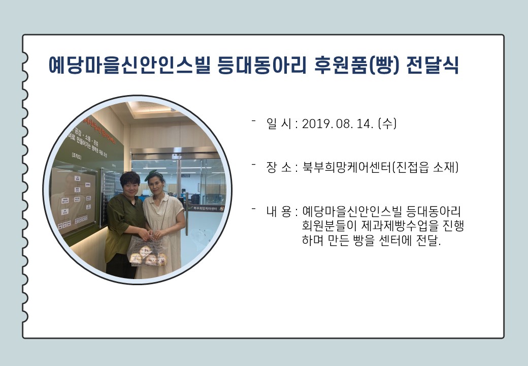 북부희망케어센터는 지난 8월 지역사회와 다양한 사업을 진행하였습니다. 항상 북부희망케어센터와 지역사회를 위해 나눔을 해주시는 모든 분께 감사드립니다. 자세한 내용은 이미지를 참고해주세요.