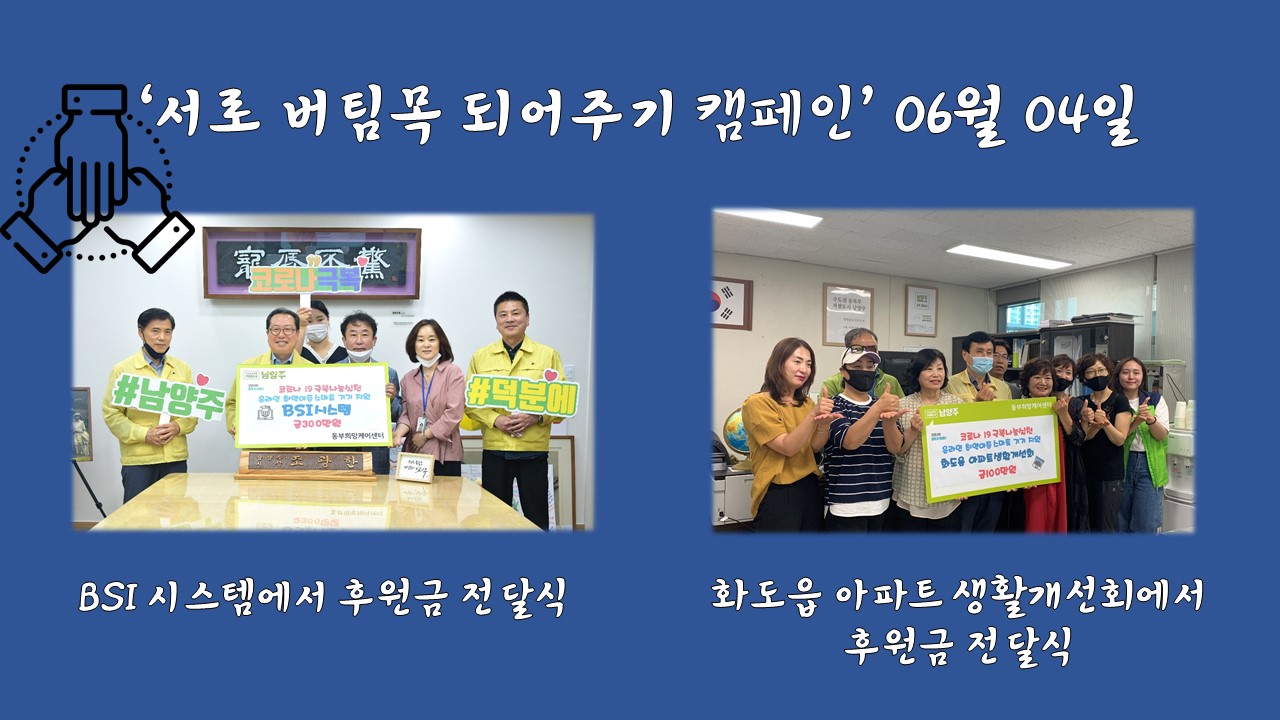 동부희망케어센터 동부희망케어센터, BSI 시스템과 화도읍 아파트 생활개선회에서 기부금 전달식 등록일자 2020-06-23 조회 169 내용 6월 4일에 진행한 전달식은 화도읍 아파트 생활개선회에서 100만원, BSI 시스템에서 300만원을 후원했다. 후원금은 코로나19로 온라인학습에 필요한 스마트기기를 지원하는데 사용될 예정입니다. 첨부파일 10)BSI,아파트생활개선회.JPG [ Size : 174.88KB, Down : 59 ] 미리보기 다운로드 목록보기