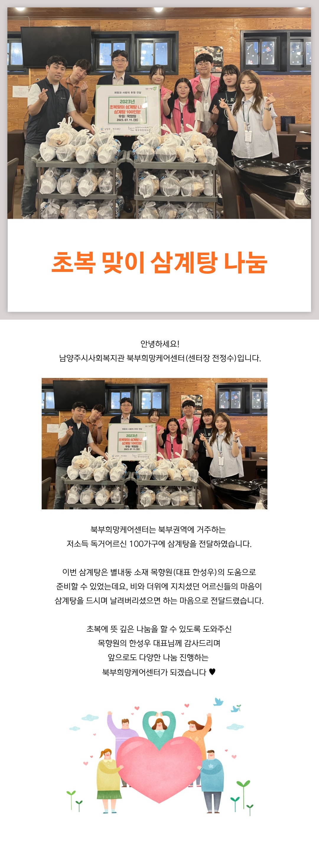 북부희망케어센터 북부희망케어센터 / 초복 맞이 삼계탕 나눔 등록일자 2023-08-30 조회 188 내용 . 첨부파일 1_초복 맞이 삼계탕 나눔.jpg [ Size : 638KB, Down : 67 ] 미리보기 다운로드 목록보기