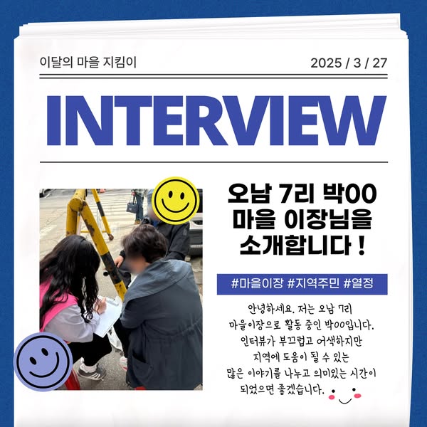 지난 27일 북부희망케어센터는 오남읍 소재 아파트에서 주민 만나기 활동을 진행하였으며, 마을 이장님과의 인터뷰를 통해 다양한 이야기를 들어볼 수 있었습니다. 오남 7리 마을 이장님과의 마을 이야기 지금 바로 만나보시죠!
