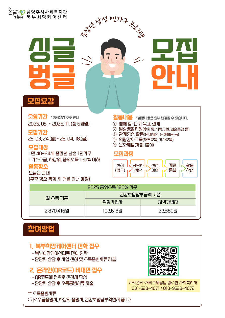 남양주시사회복지관 북부희망케어센터(센터장 전정수)에서 중장년 남성 1인가구 생애설계 프로그램 싱글벙글 참여자를 모집합니다!