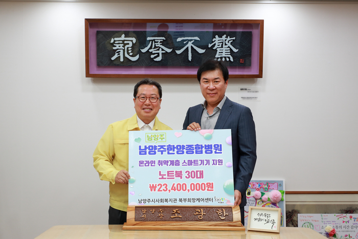 오남읍에 소재한 한양병원(이사장 장진혁)은 온라인 취약계층을 위한 노트북 30대(2천 5백만원 상당)를 북부희망케어센터에 기부했다. 장진혁 이사장은 "그동안 지역사회 내에서 청소년들을 위한 후원에 동참할 기회가 없었는데 남양주시의 한발 앞선 복지행정에 동참하고자 노트북을 기부하게 됐으며, 기부한 노트북이 학생들의 정보격차 해소에 도움이 되길 바란다."고 밝혔다. 한편, 의료법인 한양의료재단 남양주 한양병원은 2011년부터 대한노인회 남양주지회와 협약해 경제적으로 어려움을 겪는 어르신에 대한 후원을 통해 지역사회와 소통하는 의료기관으로 자리매김하고 있으며, 코로나19 발생이후 선별진료소 운영과 음압격리치료, 구급차 지원 등 지역 내 감염병 확산 방지를 위해 최선을 다하고 있다.