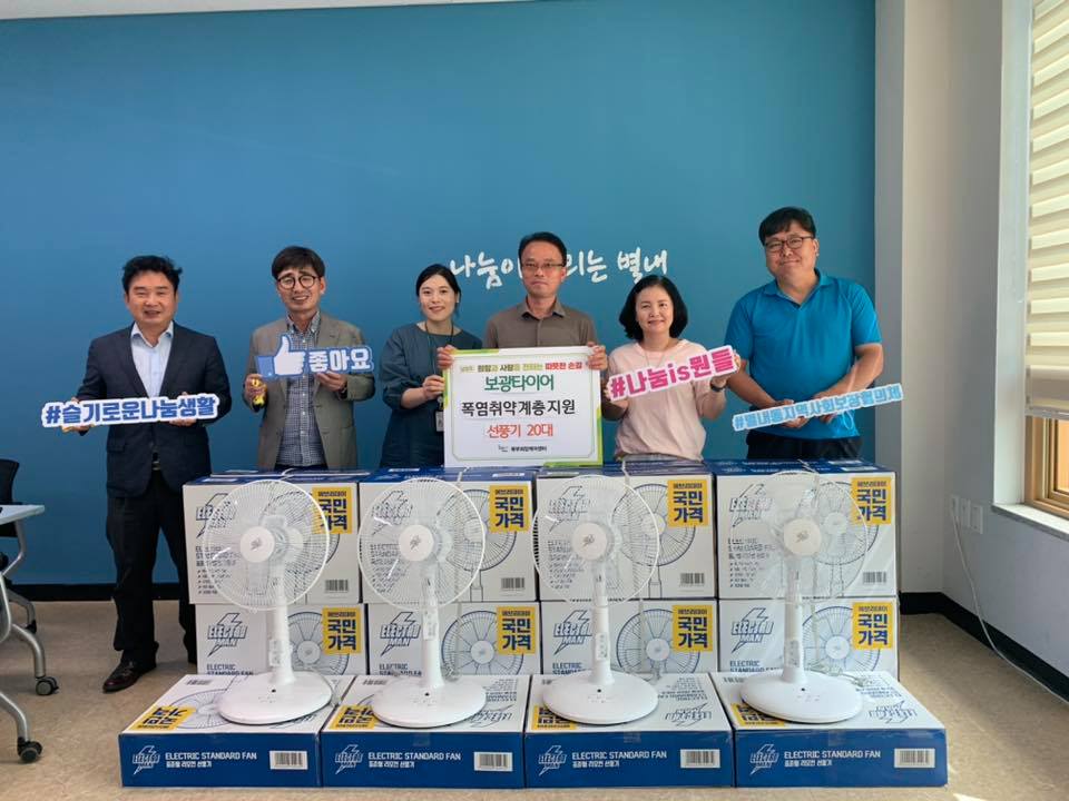 별내동에 위치한 (주)보광타이어(대표 김태환)에서 북부희망케어센터에 선풍기 20대를 전달해주셨다. 올해는 작년에 비해 무더위가 더 빨리 찾아올 거라는 소식을 들으시고 다가 올 폭염에 대비해 선풍기 20대를 흔쾌히 지역사회 소외계층을 위해 사용해달라며 전달해주셨다. 전달해주신 선풍기는 지역사회 소외계층을 위해 사용 될 예정이다. 또한, 보광타이어 김태환 대표님은 후원품 뿐 아니라 평소 결연 후원을 통해 많은 아동들의 생계비와 교육비에 지원을 해주고 계신다.