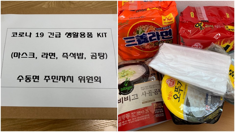 지난 4일 수동면 주민자치위원회는 이번 코로나 19 바이러스로 인해 생활에 어려움을 겪고 있는 사람들을 위해 ‘코로나 19 긴급 생활용품 키트’를 동부희망케어센터에 후원하였다. 수동면 주민자치위원회에서 전달한 ‘코로나 19 긴급 생활용품 키트’는 총 50개로 마스크, 라면, 즉석밥, 곰탕 등으로 이루어져있다.