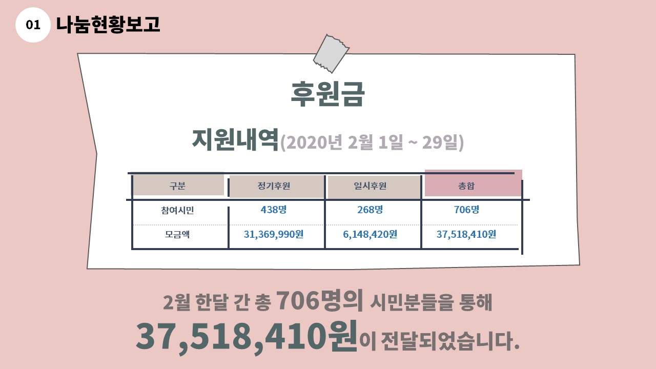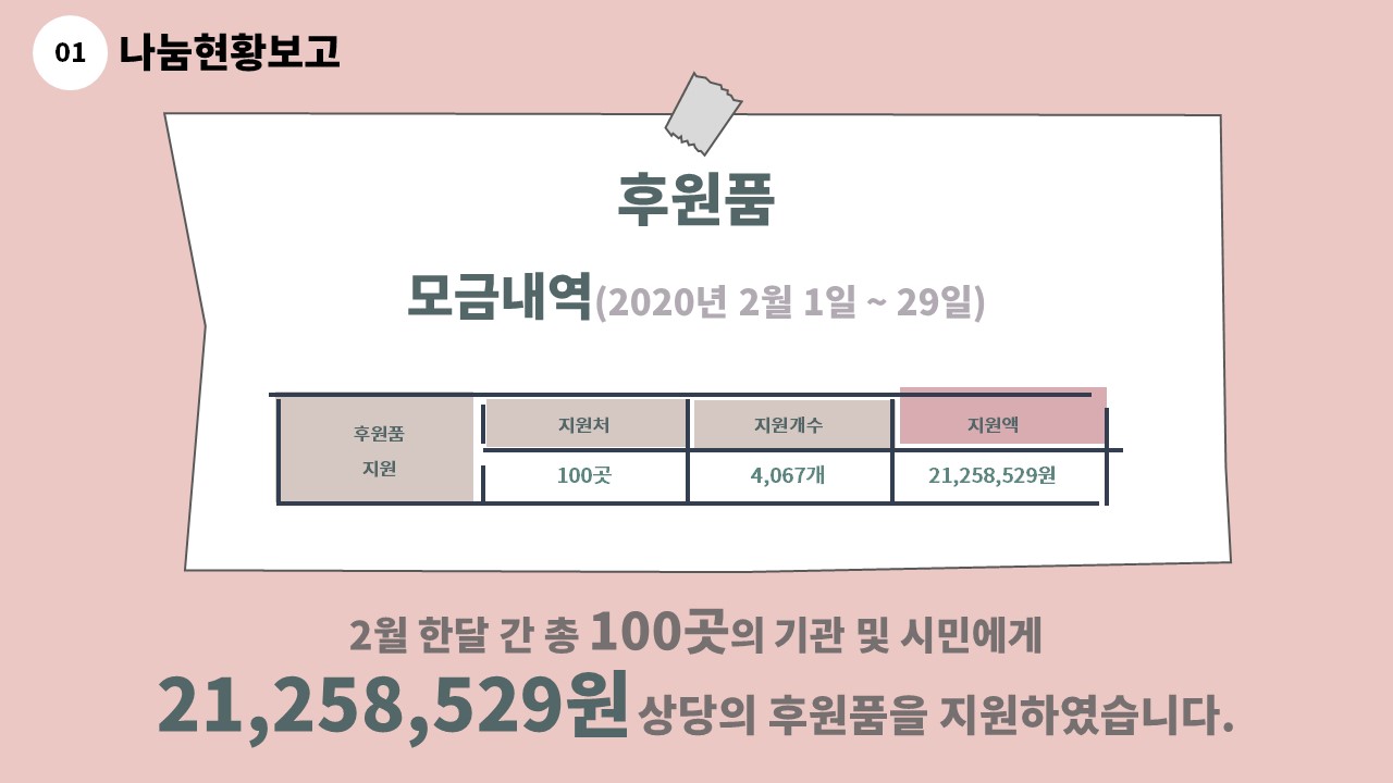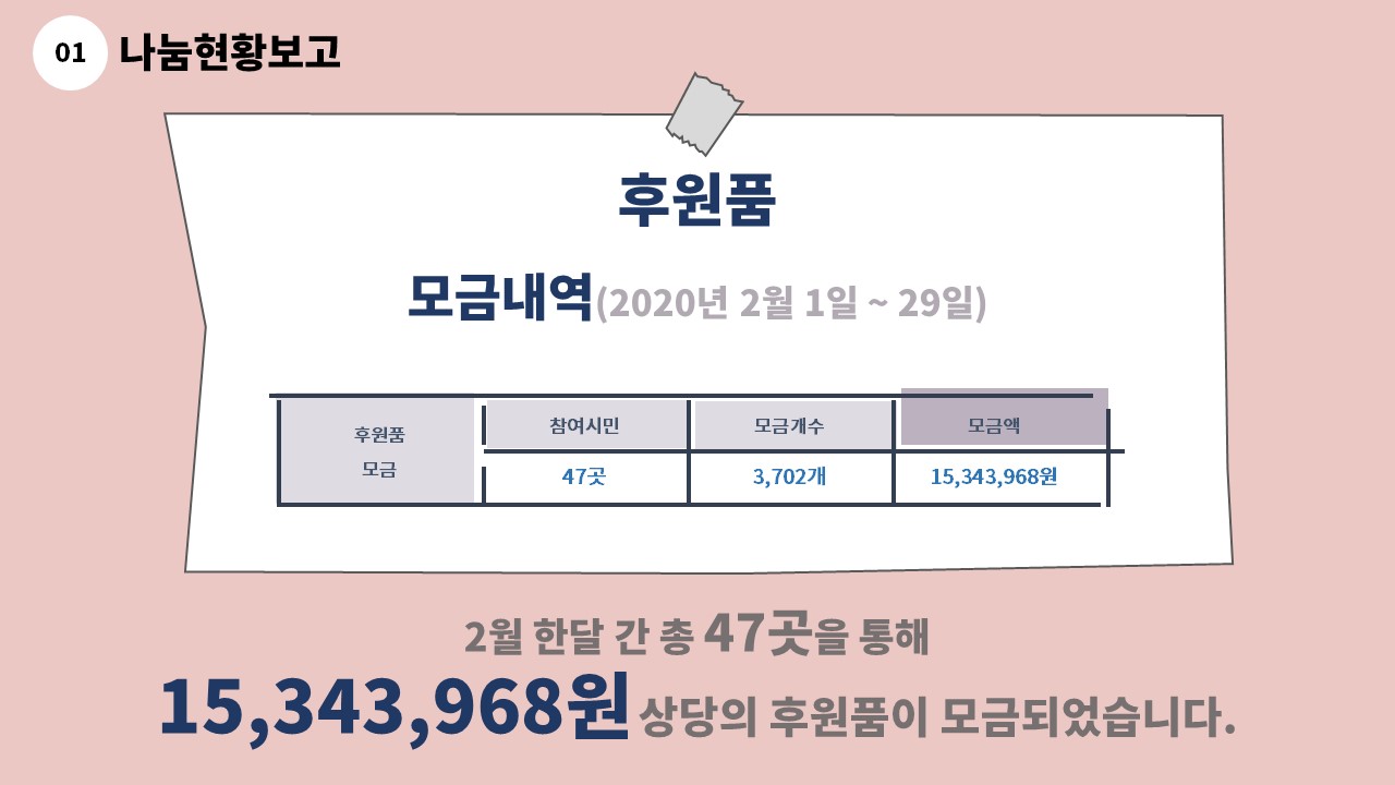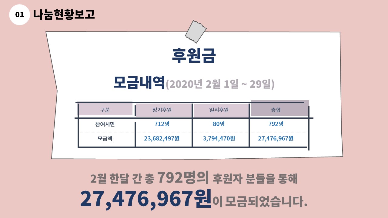 지난 2020년 2월 지역주민들이 함께 나누어주셨던 따뜻한 나눔현황을 보여드리고자합니다. 2월 한달 간 792명의 시민분들이 27,476,967원의 후원금을 47명의 시민분들이 15,343,968원 상당의의 후원품을 나누어주셨습니다. 항상 북부희망케어센터와 지역사회를 위해 나눔을 해주시는 모든 분께 감사드립니다. 자세한 내용은 이미지를 참고해주세요.