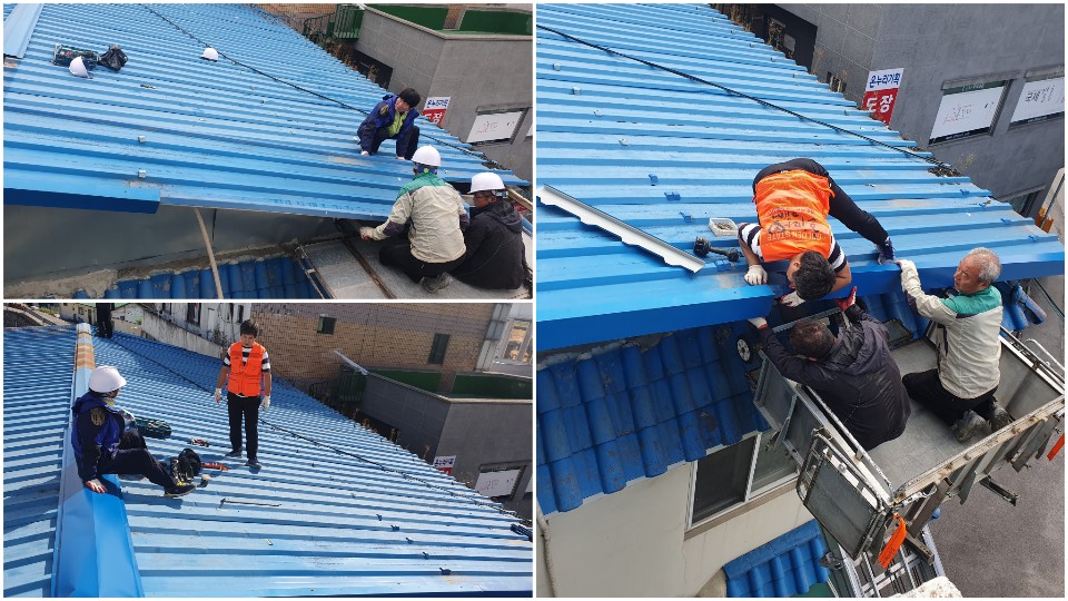 지난 17일 동부희망하우스 봉사단의 지역사회 내 봉사활동이 있었습니다. 지난 태풍 ‘링링’으로 마석에 위치한 한 건물의 지붕 판넬이 훼손되어 언제 떨어질지 모르는 아슬아슬한 상황의 지붕을 수리하는 활동이었습니다. 지역의 많은 어르신들이 이용하고 있는 건물로 지역사회의 도움을 필요로 하였고, 이 소식을 전해들은 동부희망하우스 봉사단은 위험을 무릅쓰고 높은 지붕위에 올라가 수리하였습니다. 지역사회의 안전을 지켜주시는 동부희망하우스 봉사 단원 여러분 감사드립니다.