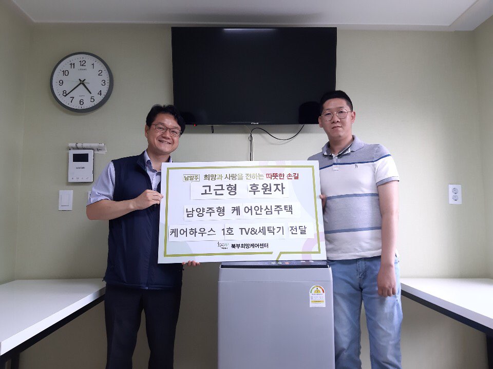남양주시 북부희망케어센터(센터장 류시혁)는 24일, 남양주시청에서 장애인 행정도우미로 근무하는 고근형씨로 부터 47만원 상당의 가전제품(TV 1대, 세탁기 1대)을 전달 받았다고 밝혔다. 이 후원품은 북부희망케어센터에서 LH와 협력하여 추진 중인 남양주형 케어안심주택인‘케어하우스 1호 주택’에 입주하는 어르신들을 위해서 사용되어 진다. 남양주시 케어하우스는 돌봄이 필요한 저소득 어르신들에게 주거지원과 함께 보건(의료), 복지, 문화체험 등 돌봄 서비스를 통합적으로 제공하는 사업이다. 고씨는“복지정책과에 근무하며 돌봄이 필요한 어르신들을 위한 케어하우스의 사업 취지를 알게 되었고 상대적으로 부담이 갈 수 있는 가전제품 후원을 통해 힘을 보태 주고 싶었다”며 후원의 뜻을 밝혔다. 한편, 고씨는 2017년부터 희망케어센터와 인연을 맺고 지역의 어려운 이웃들을 위한 세심한 배려심으로 대상별 꼭 필요한 물품(실버카, 계란, 식료품, 선풍기, 미세먼지 마스크 지원 등)후원을 이어오고 있다.