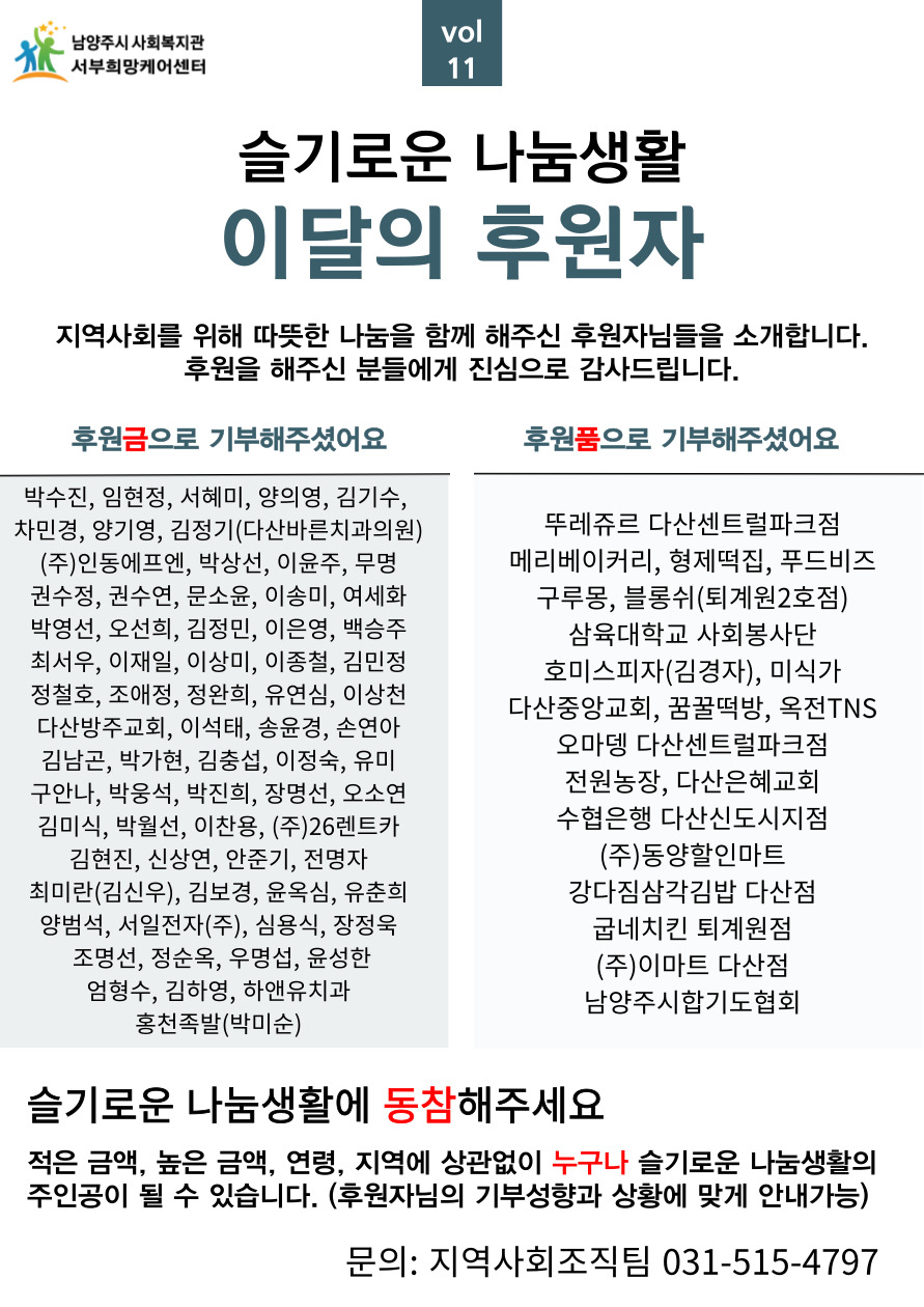서부희망케어센터 슬기로운 나눔생활, 이달의 후원자_11월 등록일자 2024-12-24 조회 98 내용 지난 11월에도 웃음 가득한 지역사회를 만들기 위해 총 91명(곳)의 후원자가 서부희망케어센터와 함께해 주셨습니다.나눔문화 확산을 위해 자발적으로 나눔을 실천해 주신 후원자분들에게 다시 한번 감사의 인사를 전하며,슬기로운 나눔 생활에 동참해 주실 분들은 언제든지 031-515-4797로 연락 부탁드리겠습니다.감사합니다. 첨부파일 이달의 후원자.jpg [ Size : 280.67KB, Down : 40 ] 미리보기 다운로드 목록보기