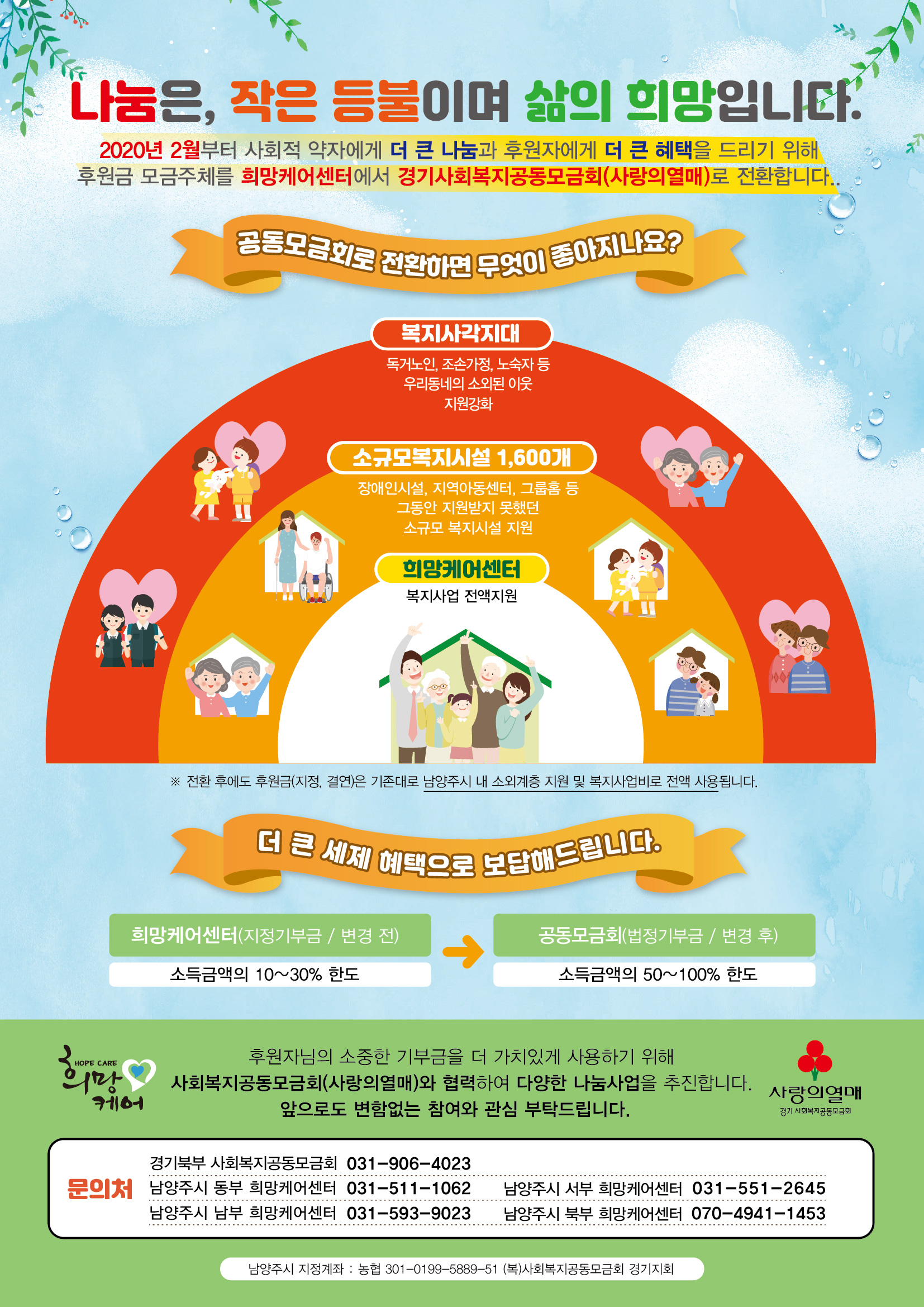 2020년 2월부터 사회적 약자에게 더 큰 나눔과 후원자에게 더 큰 혜택을 드리기 위해 후원금 모금주체를 희망케어센터에서 경기사회복지공동모금회(사랑의열매)로 전환합니다. 이에 따라 희망케어센터에 후원해주시는 분들께서는 개인정보수집이용 및 제공동의서를 작성하셔서 희망케어센터로 회신해주셔야 합니다. 번거롭게 해드려 송구하며 자세한 내용은 첨부파일 참조 부탁드립니다. 앞으로도 변함없는 참여와 관심 부탁드립니다! ^^