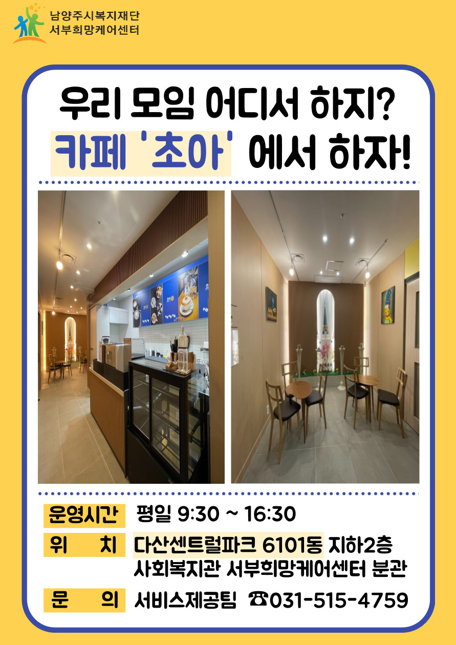 ‘초아’에서 모이면 기분이 좋아! 안녕하세요. 서부희망케어센터 커뮤니티 공간 카페 ‘초아’입니다! 카레 ‘초아’로 놀러 오세요 :) (모임 시 사전 예약후 미팅룸 이용 가능합니다.) *카페 ‘초아’는 참여자들의 자기효능감 및 사회적 지지 향상을 돕는 자활 프로그램입니다. *카페 ‘초아’는 국제로타리 3600지구 남양주 제1지역 7개 클럽, ㈜클렘본의 후원을 받아 운영되고 있습니다.