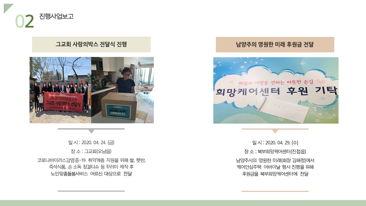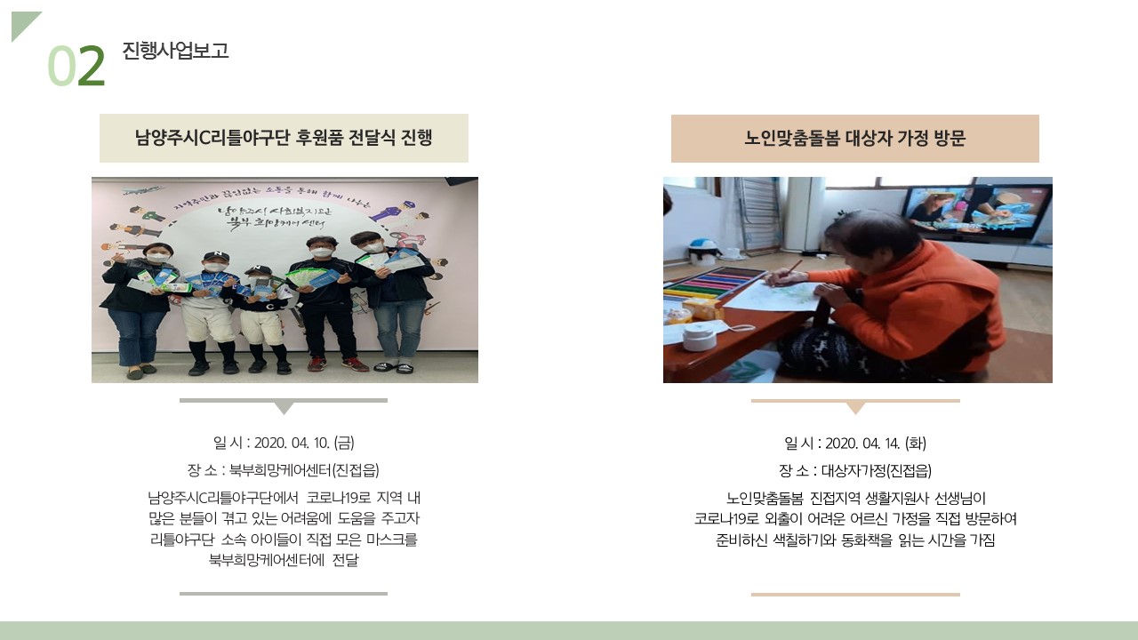 북부희망케어센터는 지난 2020년 4월 지역사회와 다양한 사업을 진행하였습니다. 항상 북부희망케어센터와 지역사회를 위해 나눔을 해주시는 모든 분께 감사드립니다. 자세한 내용은 이미지를 참고해주세요.