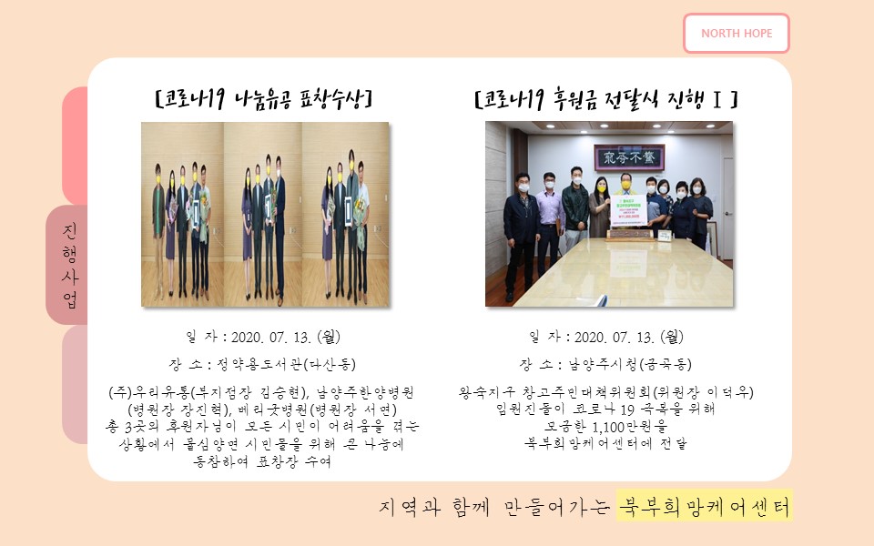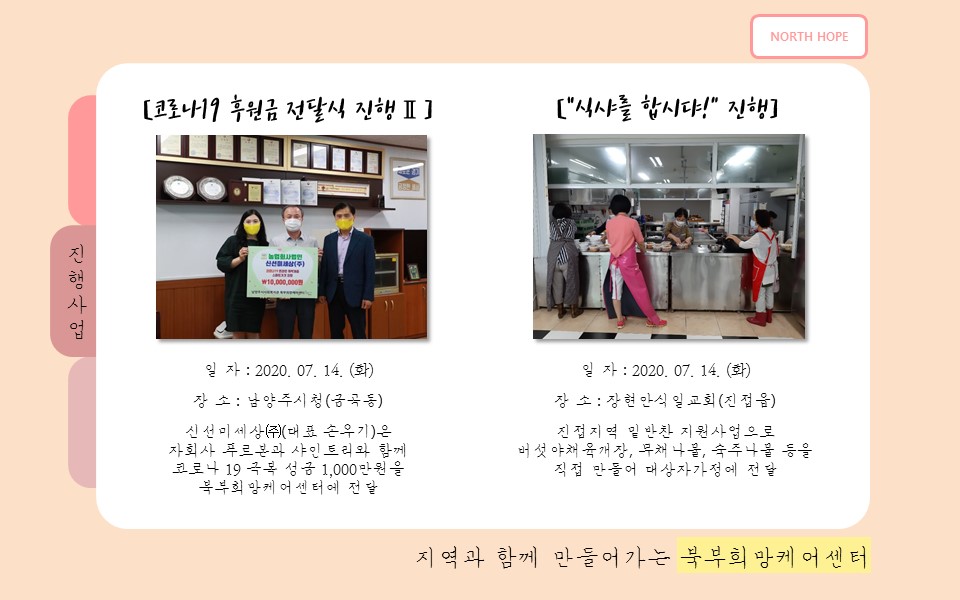 북부희망케어센터는 지난 2020년 7월 지역사회와 다양한 사업을 진행하였습니다. 항상 북부희망케어센터와 지역사회를 위해 나눔을 해주시는 모든 분께 감사드립니다. 자세한 내용은 이미지를 참고해주세요.
