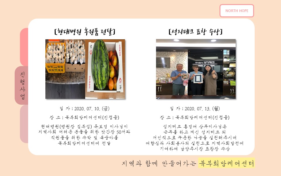북부희망케어센터는 지난 2020년 7월 지역사회와 다양한 사업을 진행하였습니다. 항상 북부희망케어센터와 지역사회를 위해 나눔을 해주시는 모든 분께 감사드립니다. 자세한 내용은 이미지를 참고해주세요.