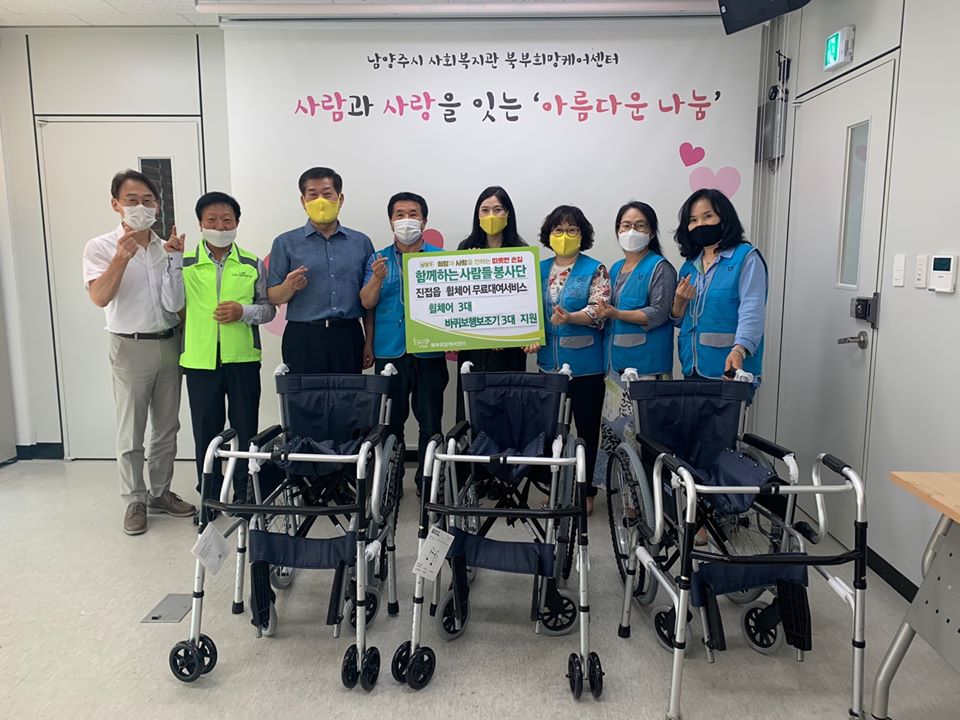 함께하는사람들봉사단(회장 김종필)은 휠체어 무료 대여서비스 사업용 휠체어 3대와 바퀴보행보조기 3대를 북부희망케어센터에 기증하였다. 후원된 휠체어와 바퀴보행보조기는 진접읍에 거주하시는 분들 중 거동이 불편하신 분과 일시적 이동에 어려움이 있으신 주민을 대상으로 실시하는 무료 대여서비스 사업에 사용될 예정이다. 함께하는사람들봉사단은 철마기업인회(회장 심성택)의 봉사단으로 구성되어 저소득가정 학생 장학금 지원, 코로나19 극복을 위한 가정의 달 나눔 기부 등 기부를 통해 지역 사회를 위한 기부활동에 지속적으로 동참하고 있다.
