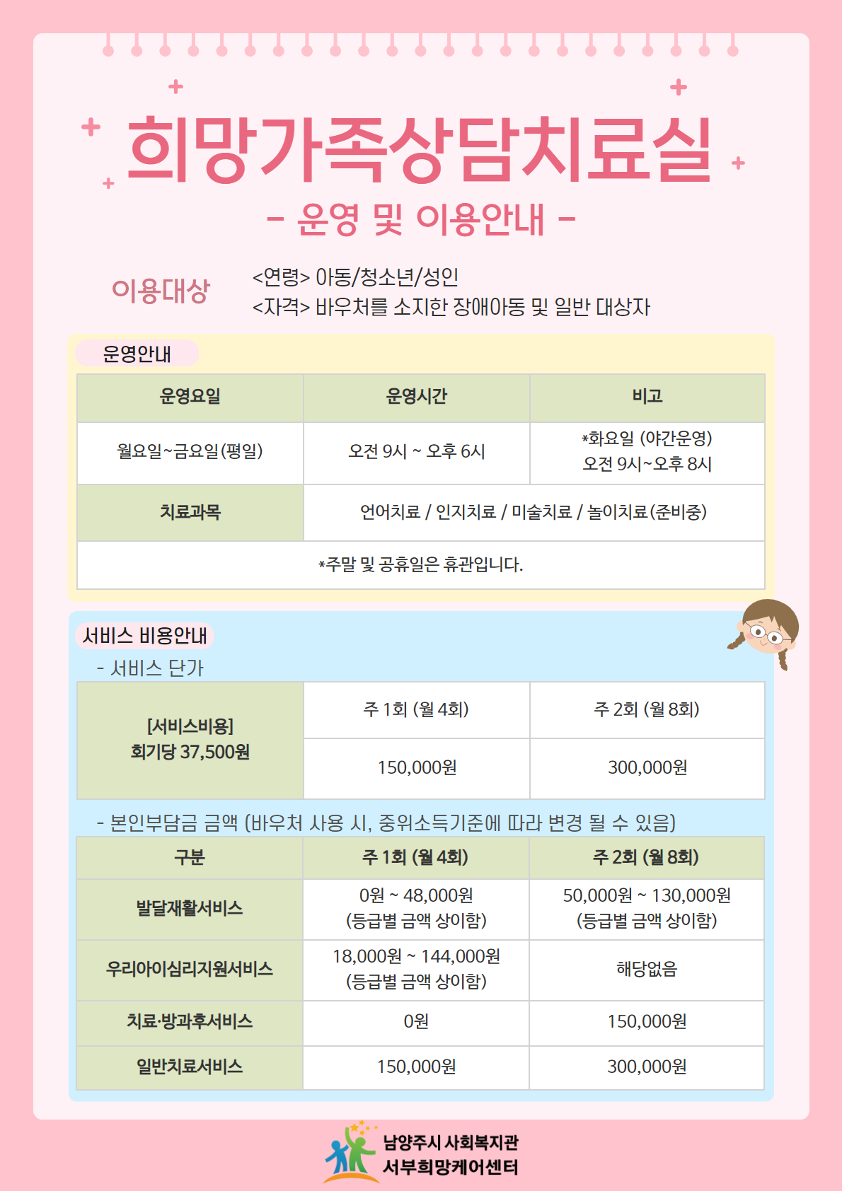 서부희망케어센터 2024년 희망가족상담치료실 발달재활서비스 제공인력 현황 및 단가 안내 등록일자 2024-02-16 조회 286 내용 희망가족상담치료실 발달재활서비스 제공인력 현황과 서비스 비용을 공고합니다. 참고하시기 바랍니다. 첨부파일 발달재활서비스 제공인력 현황(2024.02).jpg [ Size : 556.66KB, Down : 72 ] 미리보기 다운로드 희망가족상담치료실 이용안내(서비스 단가).jpg [ Size : 710.01KB, Down : 63 ] 미리보기 다운로드 목록보기