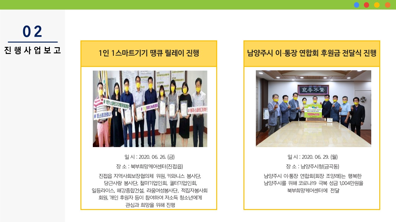 북부희망케어센터는 지난 2020년 6월 지역사회와 다양한 사업을 진행하였습니다. 항상 북부희망케어센터와 지역사회를 위해 나눔을 해주시는 모든 분께 감사드립니다. 자세한 내용은 이미지를 참고해주세요.