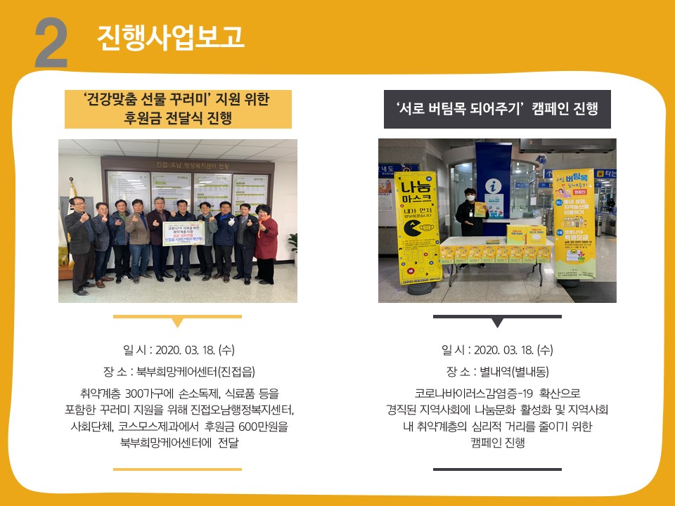 북부희망케어센터는 지난 3월 지역사회와 다양한 사업을 진행하였습니다. 항상 북부희망케어센터와 지역사회를 위해 나눔을 해주시는 모든 분께 감사드립니다. 자세한 내용은 이미지를 참고해주세요.
