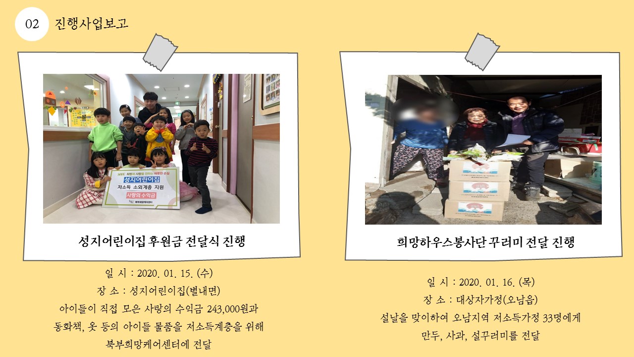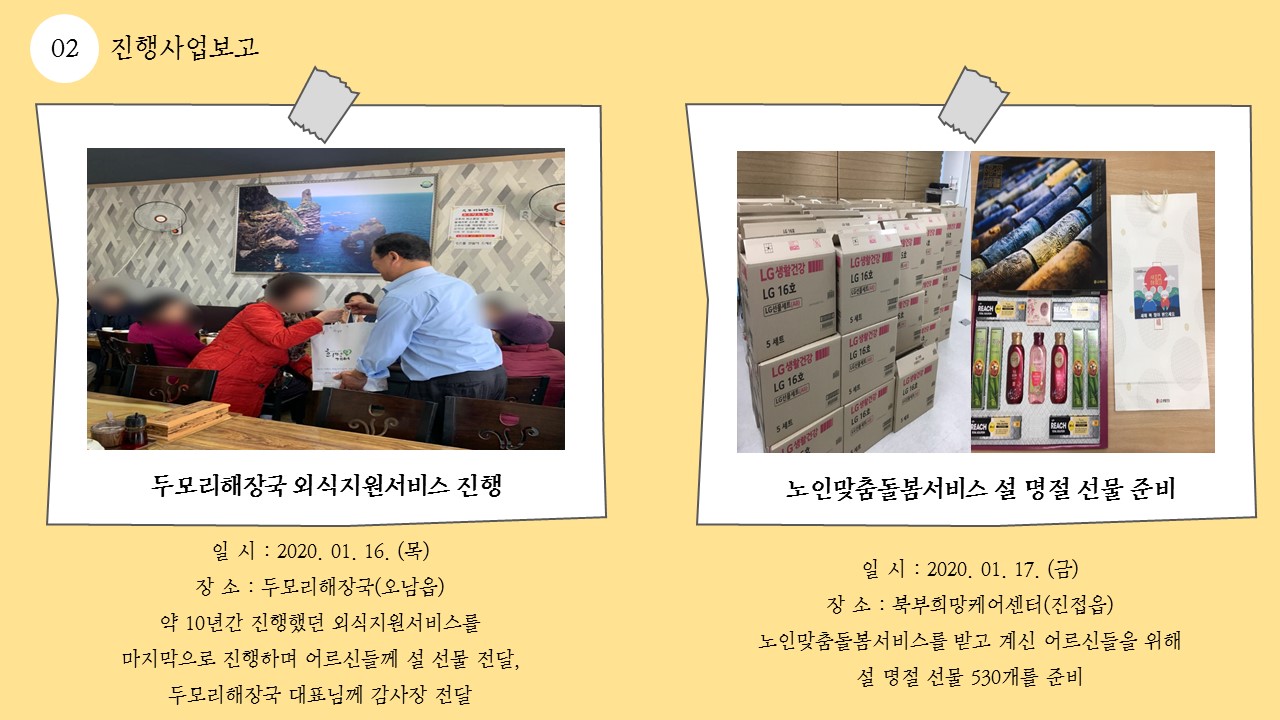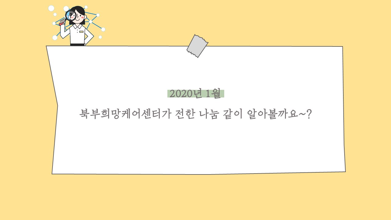 북부희망케어센터는 지난 2020년 1월 지역사회와 다양한 사업을 진행하였습니다. 항상 북부희망케어센터와 지역사회를 위해 나눔을 해주시는 모든 분께 감사드립니다. 자세한 내용은 이미지를 참고해주세요.