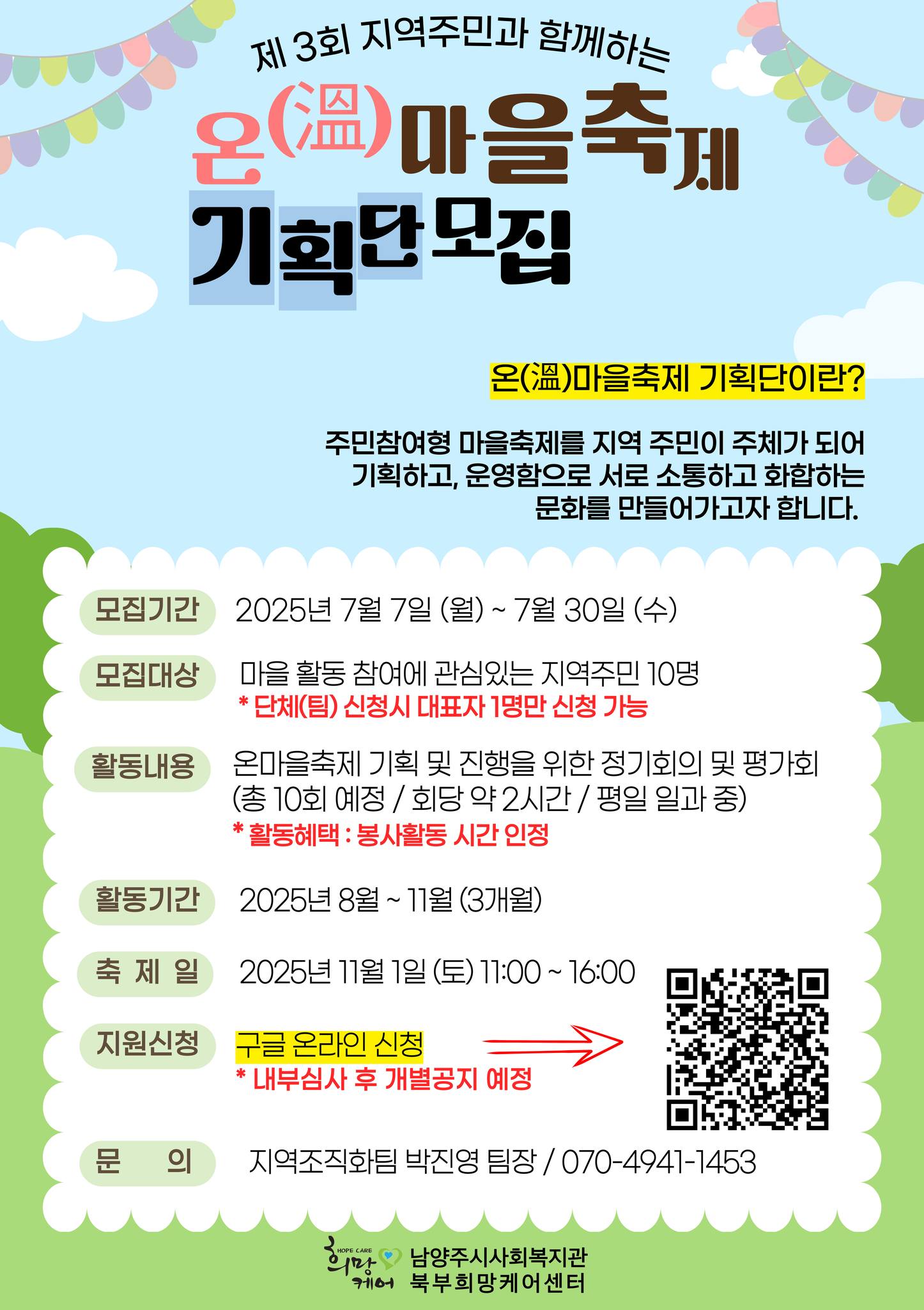 북부희망케어센터 2025년 제 3회 온(溫)마을 축제 기획단 모집 등록일자 2025-07-16 조회 85 내용 남양주시사회복지관 북부희망케어센터(센터장 전정수)는 2025년 11월 1일에 진행될 제 3회 지역주민과 함께하는 온(溫)마을축제에 함께할 뜨거운 열정을 가진 기획단을 모집합니다!지역주민과 함께 즐거운 축제를 만들고자 하오니 많은 분들과 관심과 참여 부탁드립니다~! 첨부파일 518113340_3137310876431569_6950083694118245338_n.jpg [ Size : 265.88KB, Down : 36 ] 미리보기 다운로드 목록보기