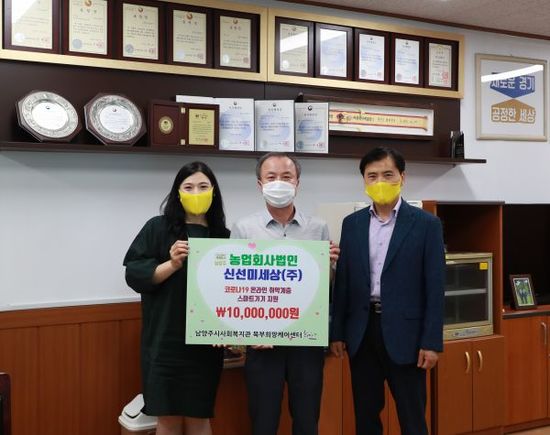 북부희망케어센터에서는 농업회사법인 신선미세상(주)과 전달식을 진행했다. 신선미세상(주)은 앞서 코로나19 온라인 취약계층을 위해 2회 후원을 하셨음에도 나눔을 함께하시고자 북부희망케어센터를 찾아주었다. 진접읍에 소재한 농업회사법인 신선미세상(주)(대표 손우기)은 자회사 푸르본과 샤인트리와 함께 코로나19 극복 성금 1,000만원을 북부희망케어센터에 전달해주었다. 전달된 후원금은 코로나19 취약계층에게 지원될 예정이다. 손우기 대표님은 "모두가 어려운 시간을 보내고 있는 상황에서 사회적 기부에 동참을 하고 싶어 참여하게 되었다. 앞으로도 기회가 되면 나눔을 지속적으로 실천하고 싶다."고 이야기했다.