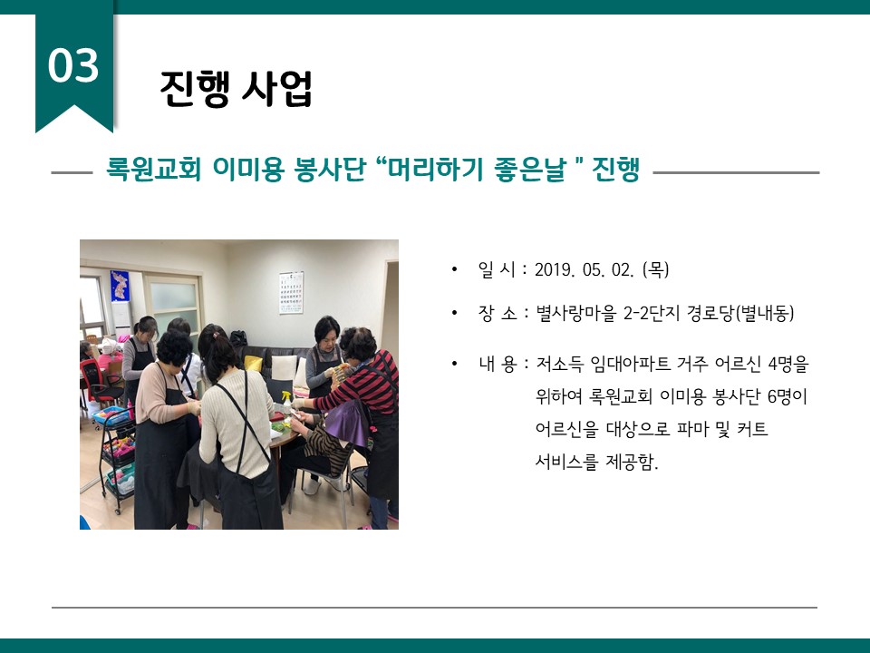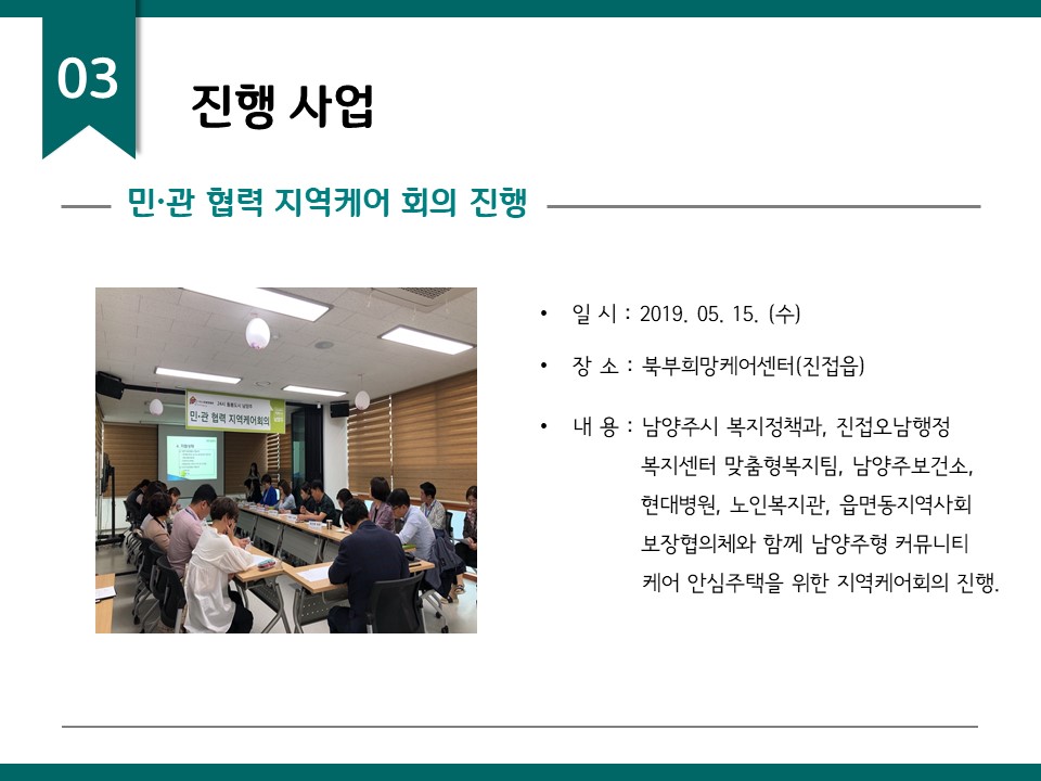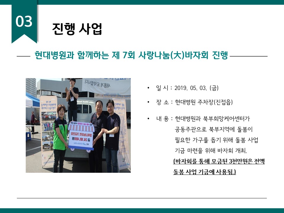 북부희망케어센터는 지난 2019년 5월 지역사회와 다양한 사업을 진행하였습니다. 항상 북부희망케어센터와 지역사회를 위해 나눔을 해주시는 모든 분께 감사드립니다. 자세한 내용은 이미지를 참고해주세요.