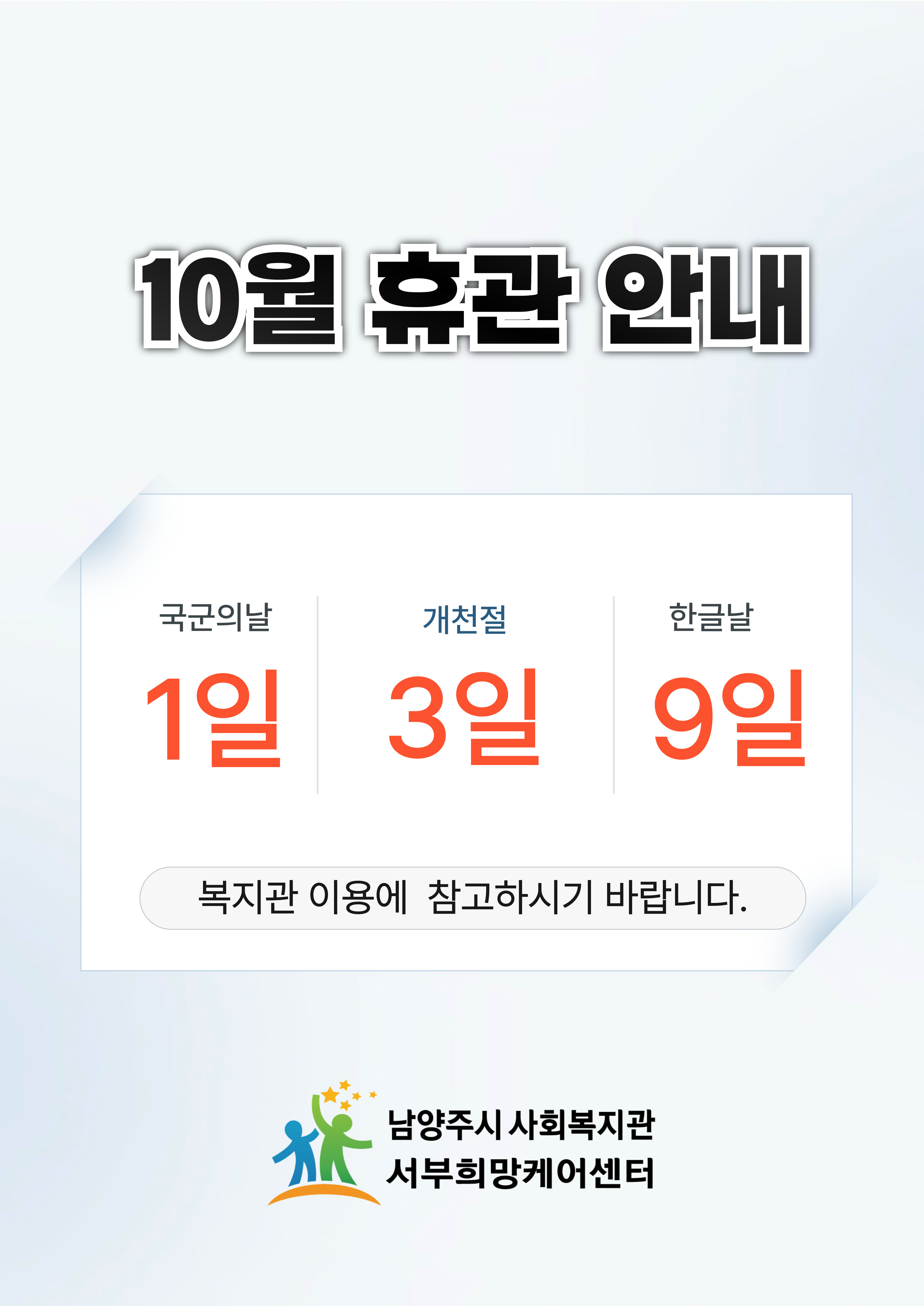 서부희망케어센터 10월 휴관 안내 등록일자 2024-09-30 조회 140 내용 안녕하세요! 남양주시 사회복지관 서부희망케어센터입니다.10. 1(화) / 10.3(목) / 10.9(수) 공휴일로 휴관이오니 이용에 참고하시기 바랍니다. 첨부파일 10월 휴관 안내.jpg [ Size : 649.21KB, Down : 81 ] 미리보기 다운로드 목록보기