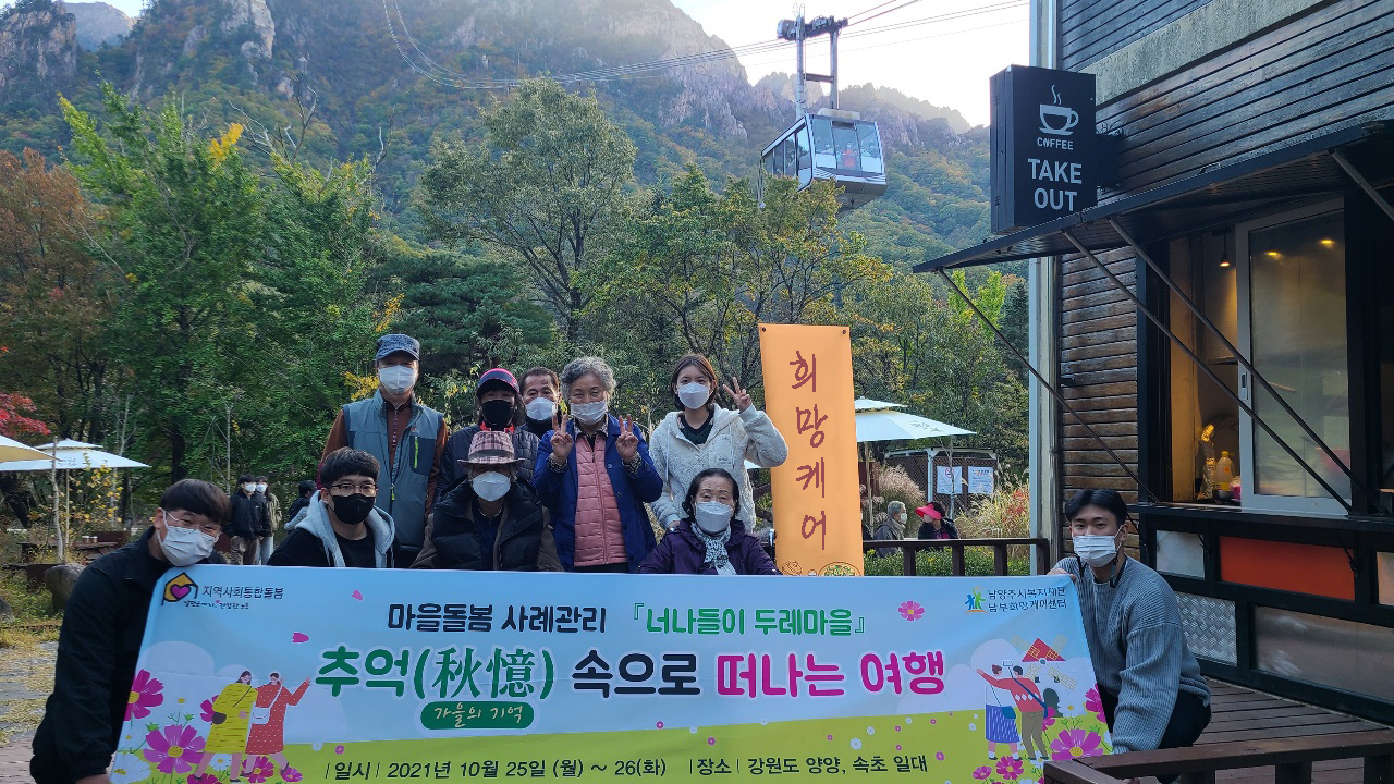 우리 남부희망케어센터에서는 지난 10월 25~26일과 11월 8일~9일 어르신 10명과 함께“추억(秋憶) 속으로 떠나는 여행”이라는 주제로 2회에 걸쳐 문화나들이를 실시했습니다!